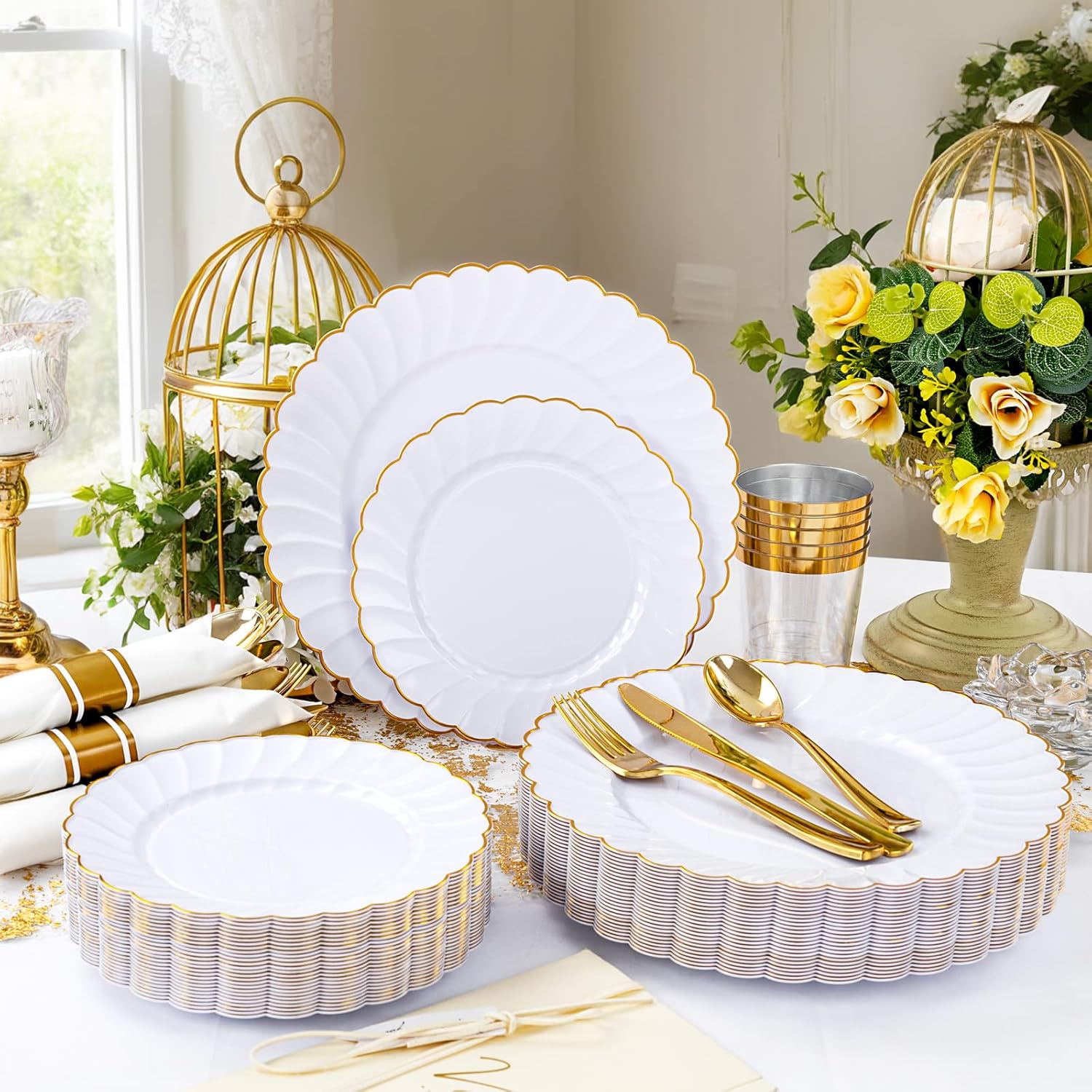 - Elegant Wedding-Ready Dinnerware Collection - Create a cohesive reception tablescape with this Gold plastic dinnerware set designed for 50 guests. The set includes 100 elegant white and gold plastic plates (50 scalloped 10.25" dinner plates and 50 scalloped 7.5" dessert plates), 150 gold silverware, 50 napkins, and 50 cups - perfect for formal plated dinners or buffet-style wedding receptions