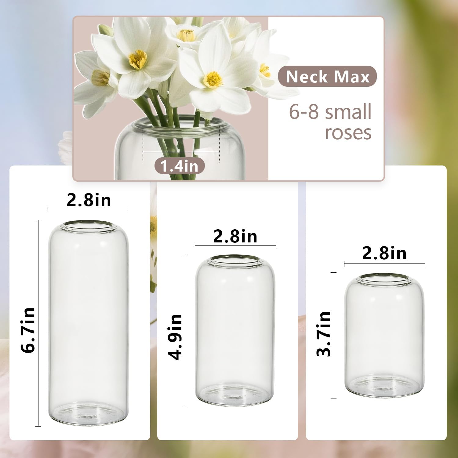 - Multi-Functional Vase Set: This set includes 3 cylindrical narrow-necked glass vases in varying heights (3.9'', 4.9'', 6.7''), each with a body diameter of 2.75‘’ and a neck opening of 1.6‘’. Designed for versatility, they effortlessly adapt to: Floral arrangements (fresh or dried stems) Succulent planting (miniature greenery displays) Floating candle holders (create ambient lighting) Decorative displays (shells, gemstones, or curated collections)