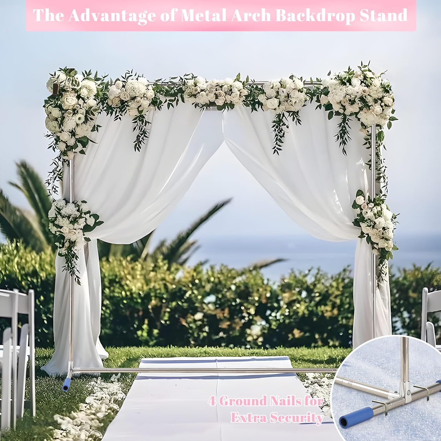 - Classic and Elegant-Classic square shape,elegant and sturdy,stable and not easy to overturn.This arched backdrop frame comes with 4 extra ground spikes which provide a firm and balanced support,better resistance to wind and rain