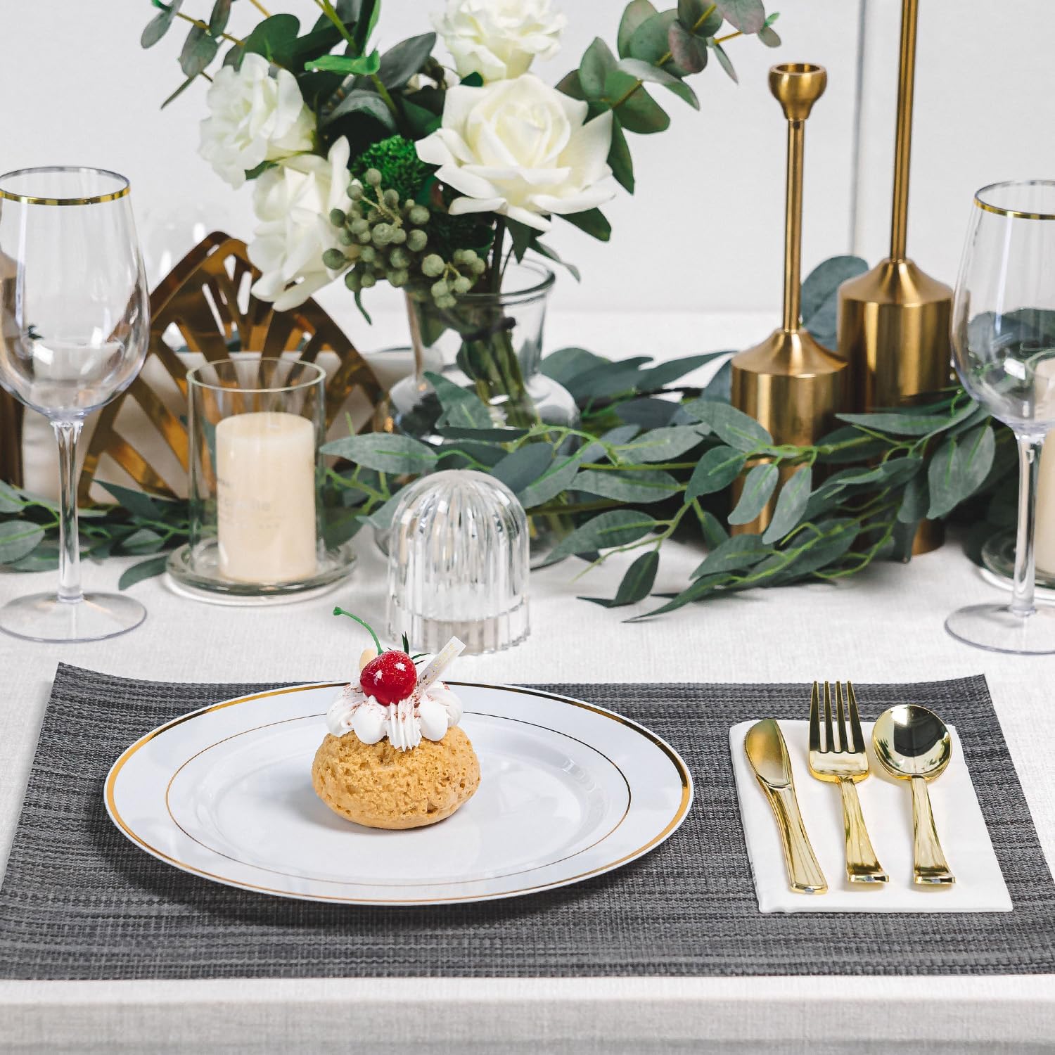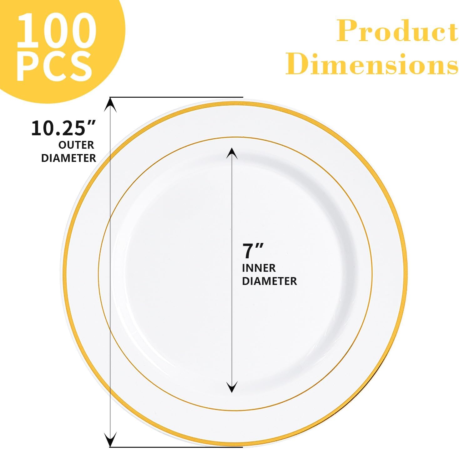 - GREAT VALUE 100 PACK: Each pack comes with 100 pcs gold 10.25 inch dinner plates, perfect for large gatherings, the white disposable dinner plates with gold rim can serve for 100 guests. Having these will complete your plastic dinnerware collection