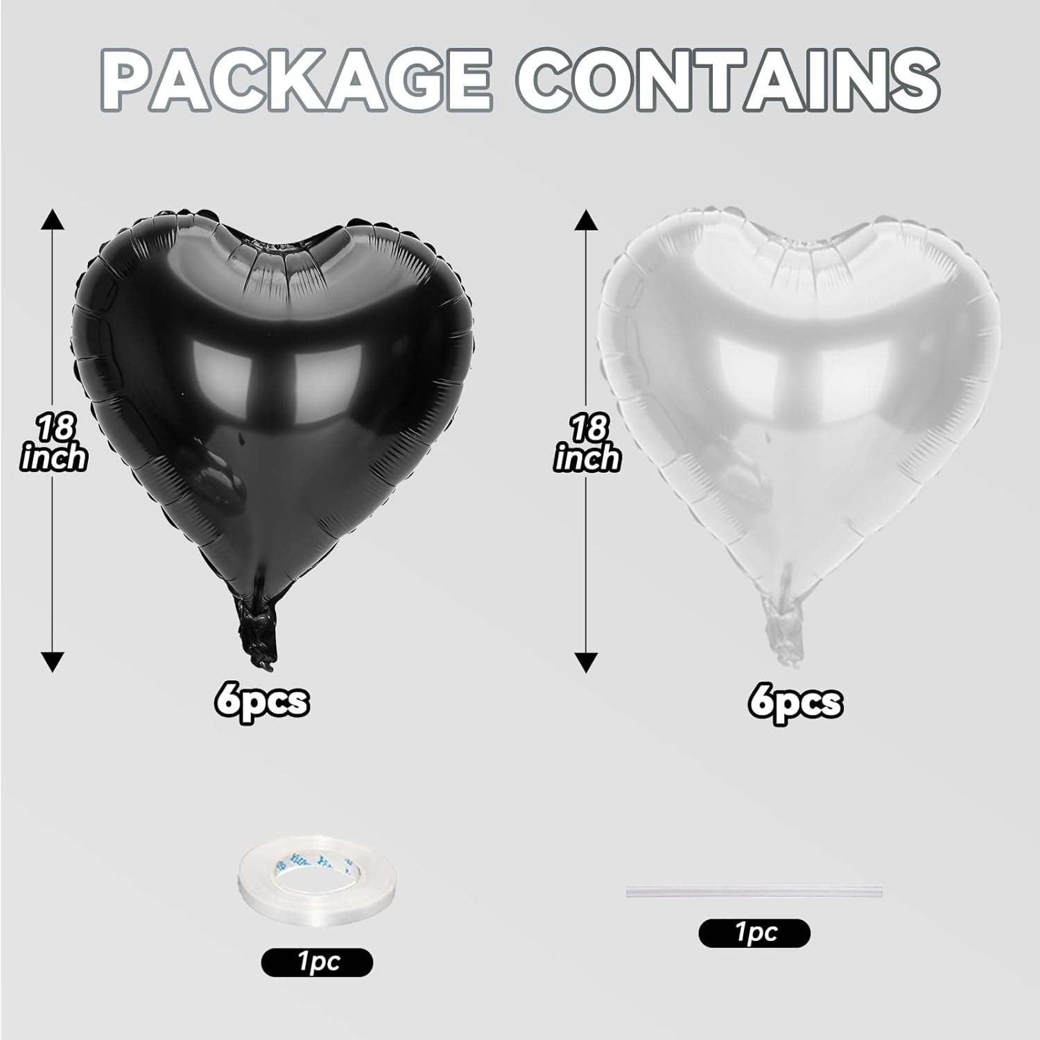 - Black Silver Heart Balloons:This 18 inches heart shaped balloons includes 6* black heart balloons, 6* silver heart balloons, 1* ribbon, 1*straw, adding romance and warmth to your celebration. These large heart balloons will be the highlight of your party decorations, creating an atmosphere of love for everyone.