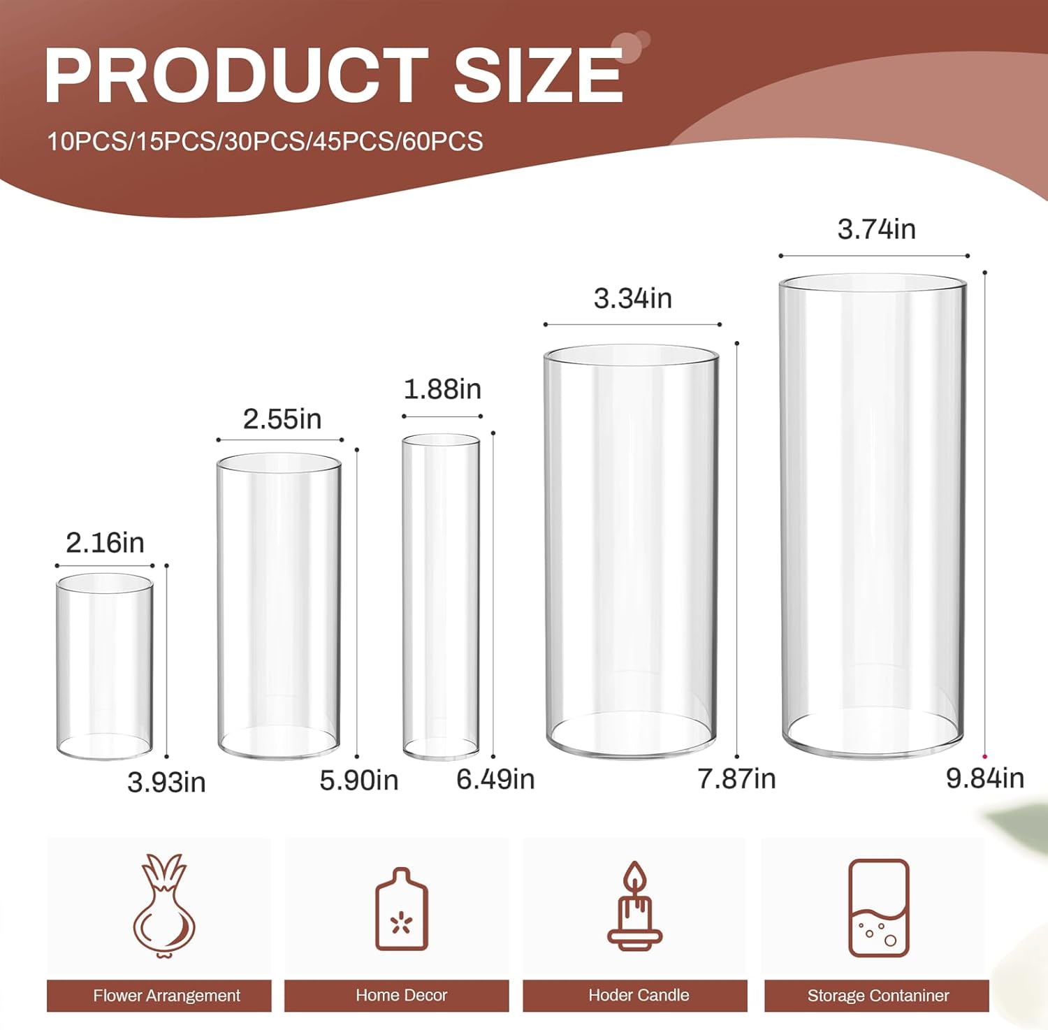 - 5-Size Cylinder Vase Set for Versatility From minimalist single stems (2.1×3.9 inchs) to lavish bouquets (3.7×9.8 inchs), 60 premium Cylinder vases in 5 sizes fit orchids, roses, or succulents.