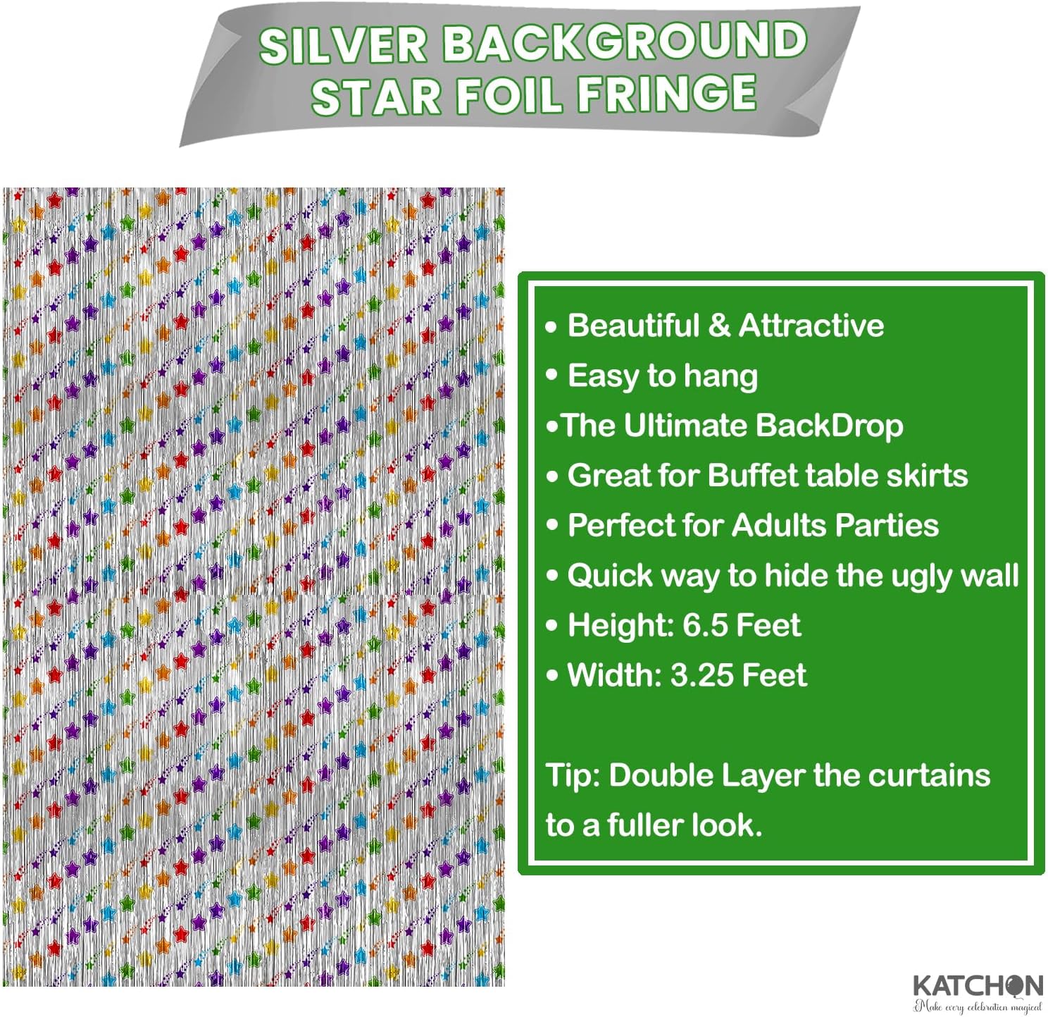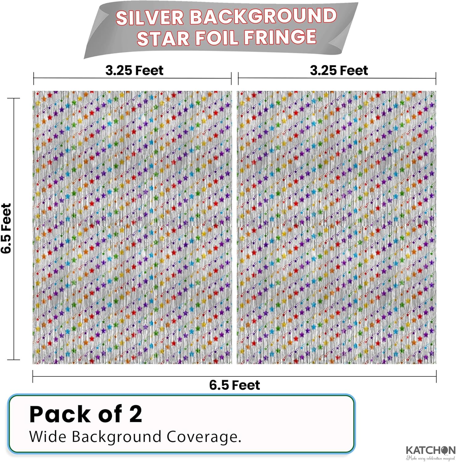 - LARGE SIZE AND PACK OF 2 : This star foil fringe curtains which measures 3.2 X 6.5 and comes in Pack of 2 is made of shiny metallic silver foil with colorful stars in purple, blue, yellow, and red. Each banner measures 3.2 feet wide by 6.5 feet tall, creating a vibrant silver fringe backdrop that’s ideal for silver party decorations, silver shimmer wall backdrop, silver photo backdrop, birthday party decorations, or silver backdrop for parties, Labor Day Decorations, and more. Also works beautifully as a silver backdrop or silver backdrop curtain for themed setups.