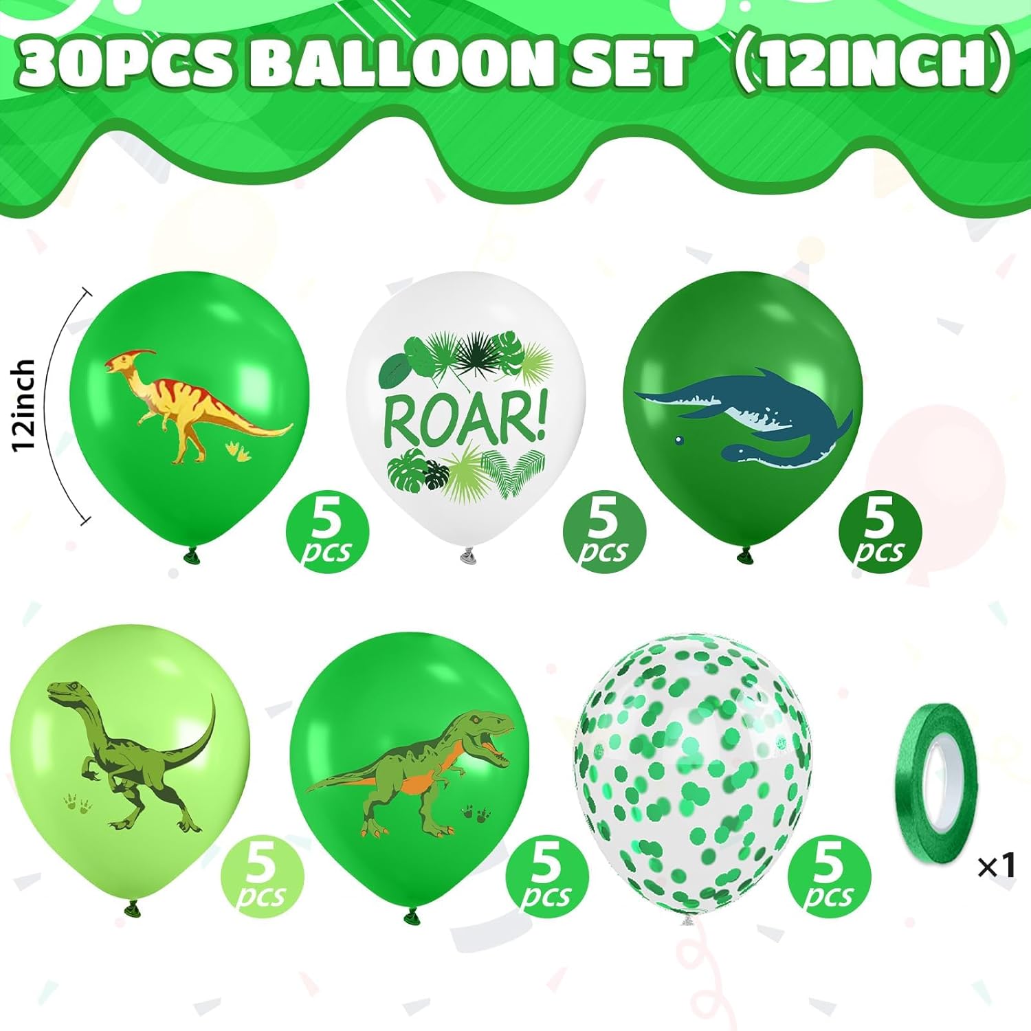 - 【Birthday Party Balloons】This dinosaur balloon set includes 30pcs 12-inch balloons: 5pcs light green balloons with dinosaur print, 5pcs white balloons with dinosaur text, 5pcs dark green balloons with dinosaur illustration, 5pcs fruit green balloons with dinosaur design, 5pcs light green dinosaur balloons, 5pcs green confetti balloons, and 1 green ribbon (10 meters). Great for dinosaur party decorations, jungle-themed events, or any celebration for boys or dinosaur-loving