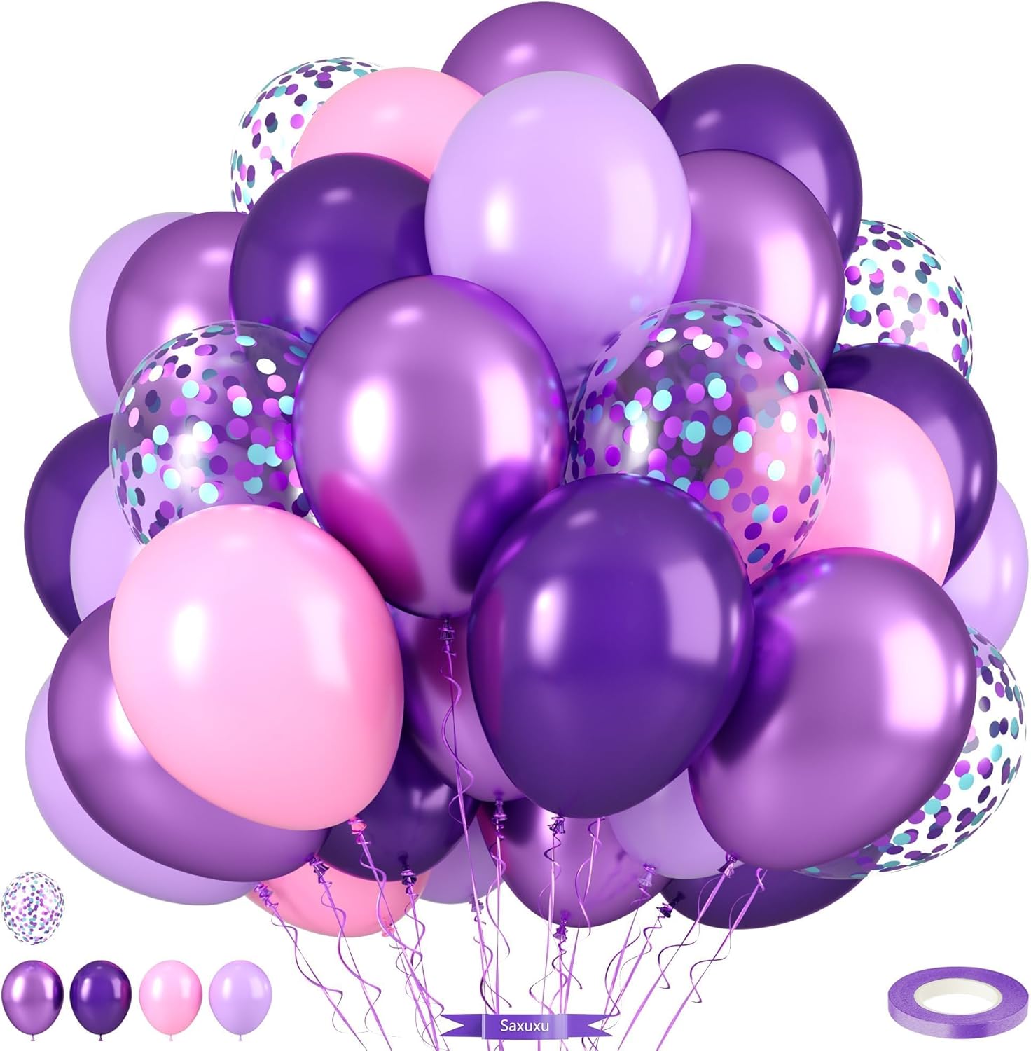 - ă12 Inch Purple and Pink Balloons SetăMacaron pink balloons (8 pcs),metallic purple balloons (3 pcs),dark purple balloons (8 pcs),light purple balloons (8 pcs),purple confetti balloons (3 pcs),purple balloon ribbon (1 roll), 30pcs in our purple birthday latex balloons set. Suitable for decorating various occasions, such as pink and purple theme party birthday baby shower anniversary graduation wedding.