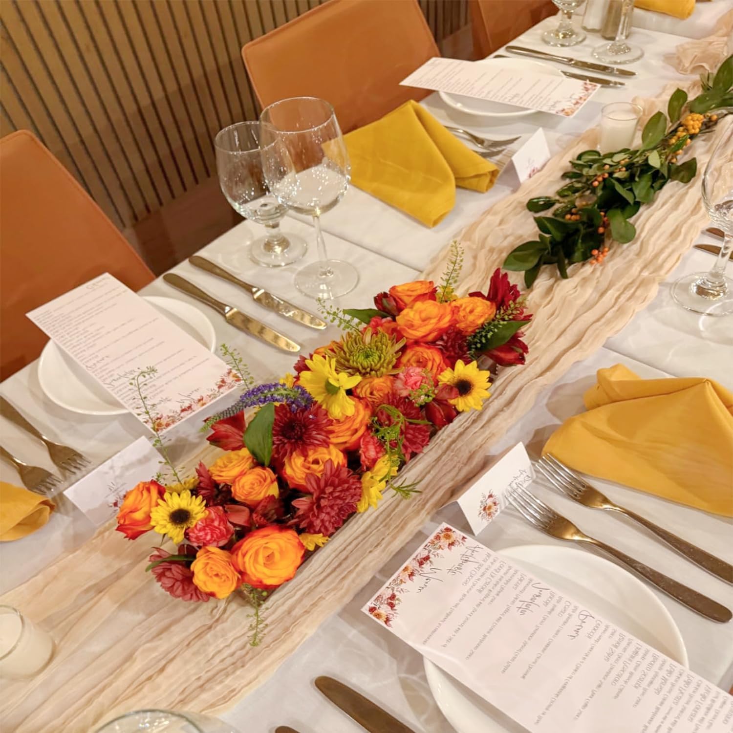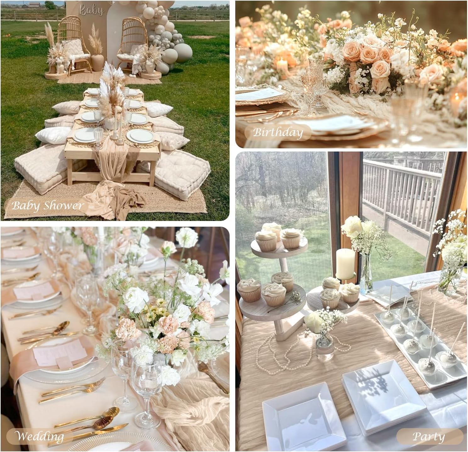 - đ„ăReusable & SoftăThese romantic beige table runner is made of premium cheese gauze fabric with beautiful crinkling. Soft feeling, reusable, washable and fade resistant. These cheesecloth table runner champagne adopt unique pleated workmanship, adding a touch of romantic and elegant to your events. The boho wedding table runner is sheer, natural drape, lightweight and skin-friendly. Soft table linen with gorgeous finished edges drapes gracefully across your banquet table, adds to romantic, delicate, and flowy vibe.