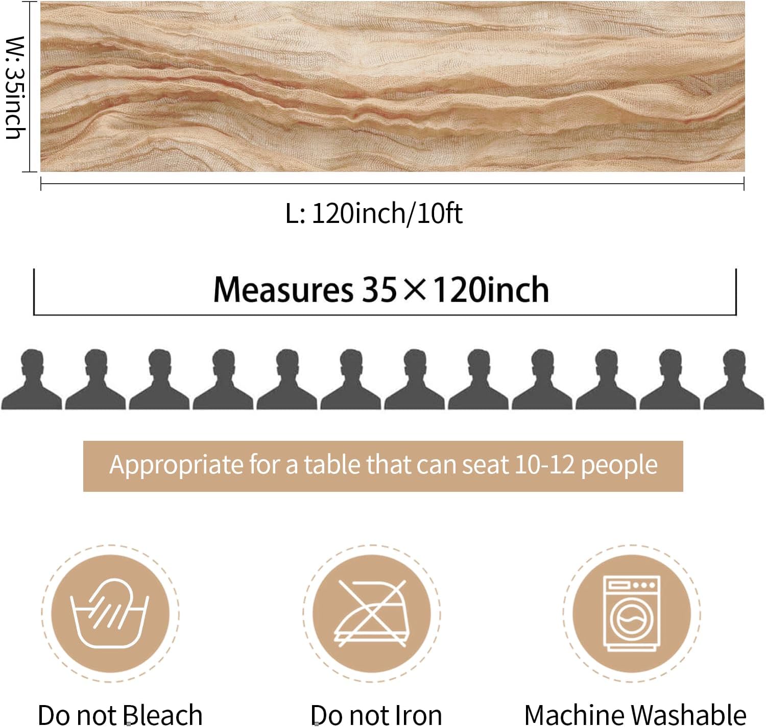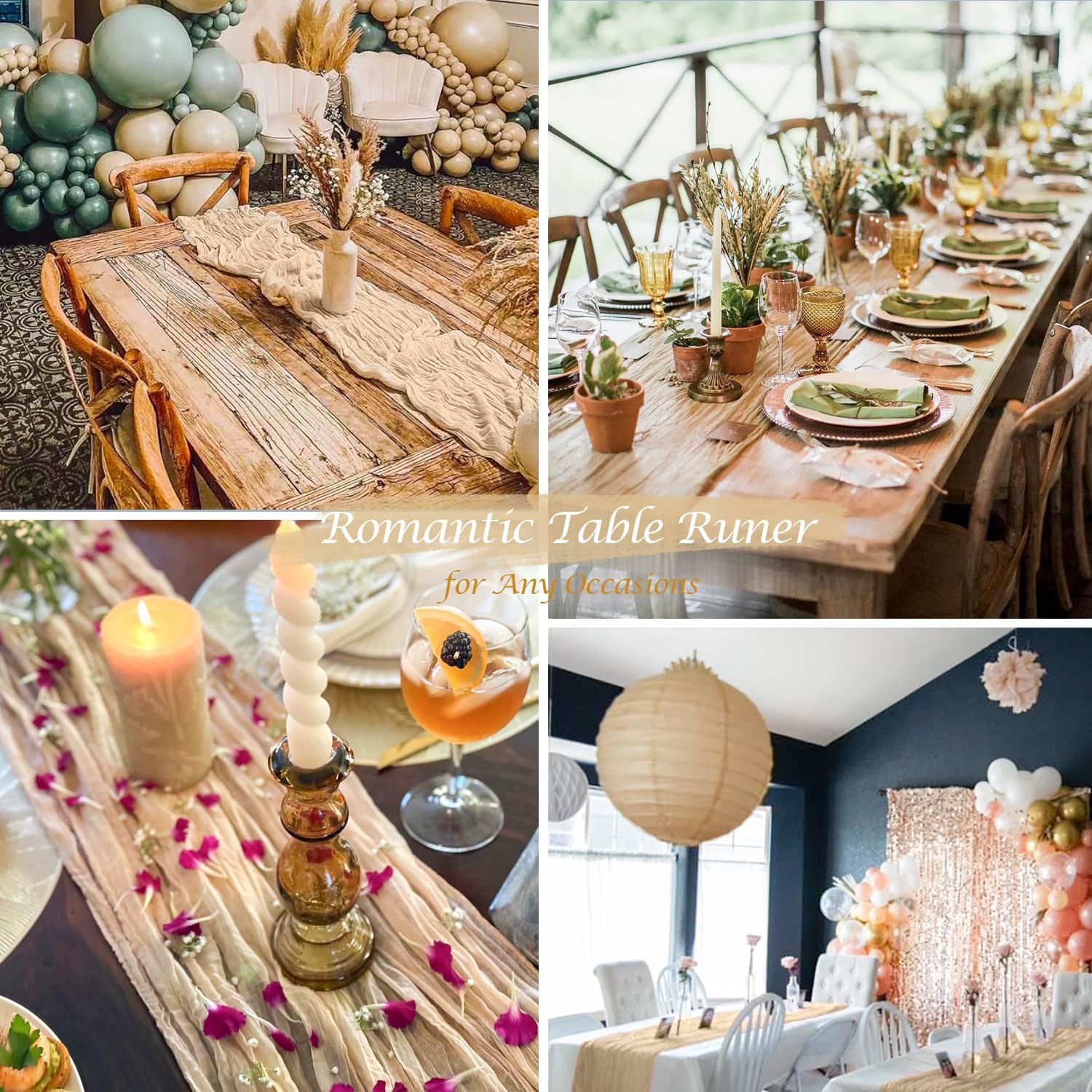 - đ„ăReusable & SoftăThese romantic beige table runner is made of premium cheese gauze fabric with beautiful crinkling. Soft feeling, reusable, washable and fade resistant. These beige cheesecloth table runner adopt unique pleated workmanship, adding a touch of romantic and elegant to your events. The boho wedding table runner is sheer, natural drape, lightweight and skin-friendly. Soft table linen with gorgeous finished edges drapes gracefully across your banquet table, adds to romantic, delicate, and flowy vibe.