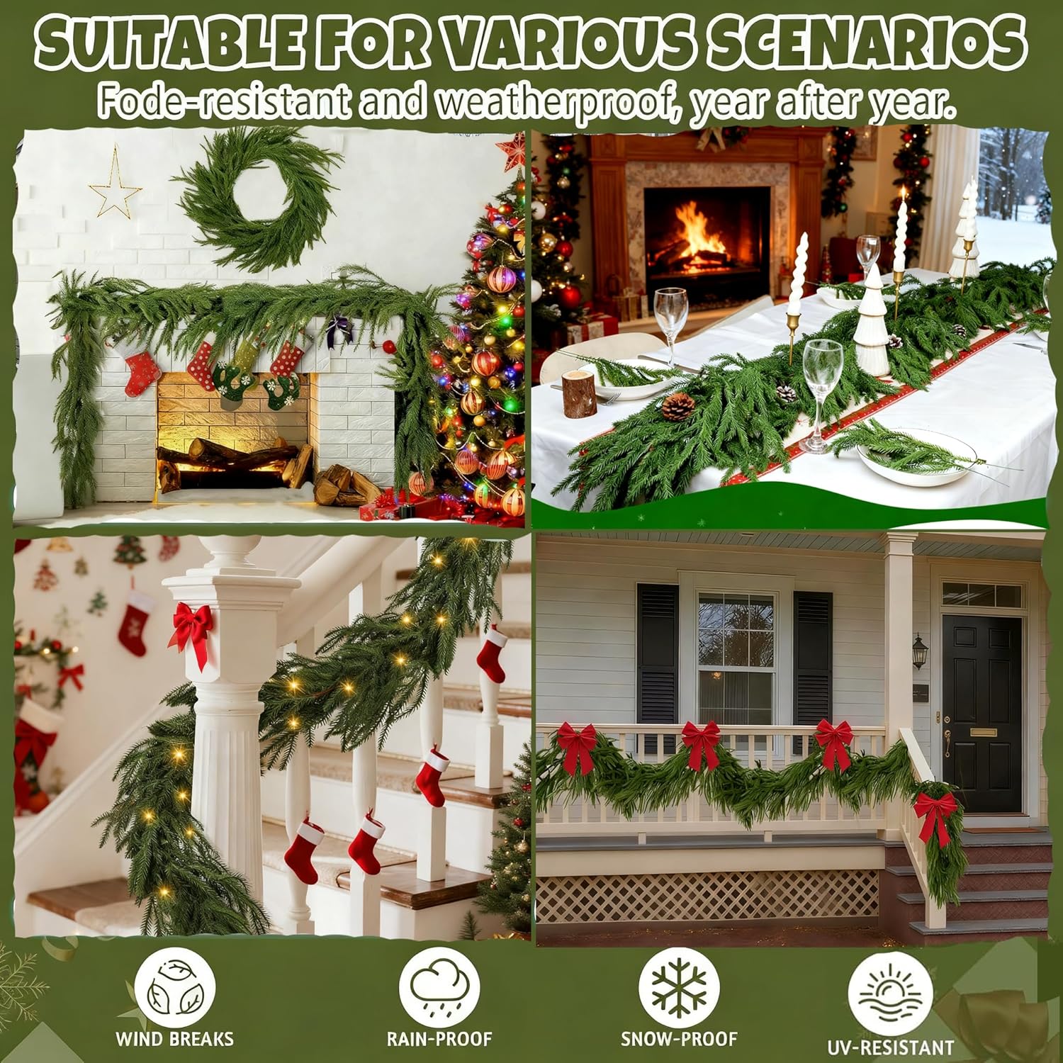 - Continue Reusing: Fake pine garland boasts a lifelike appearance; however, unlike real plants, it does not fade or rot, ensuring it always looks fresh and vibrant.xmas garland is both water-resistant and fade-resistant,after the season, you can easily store it in the provided packaging to reuse it next year