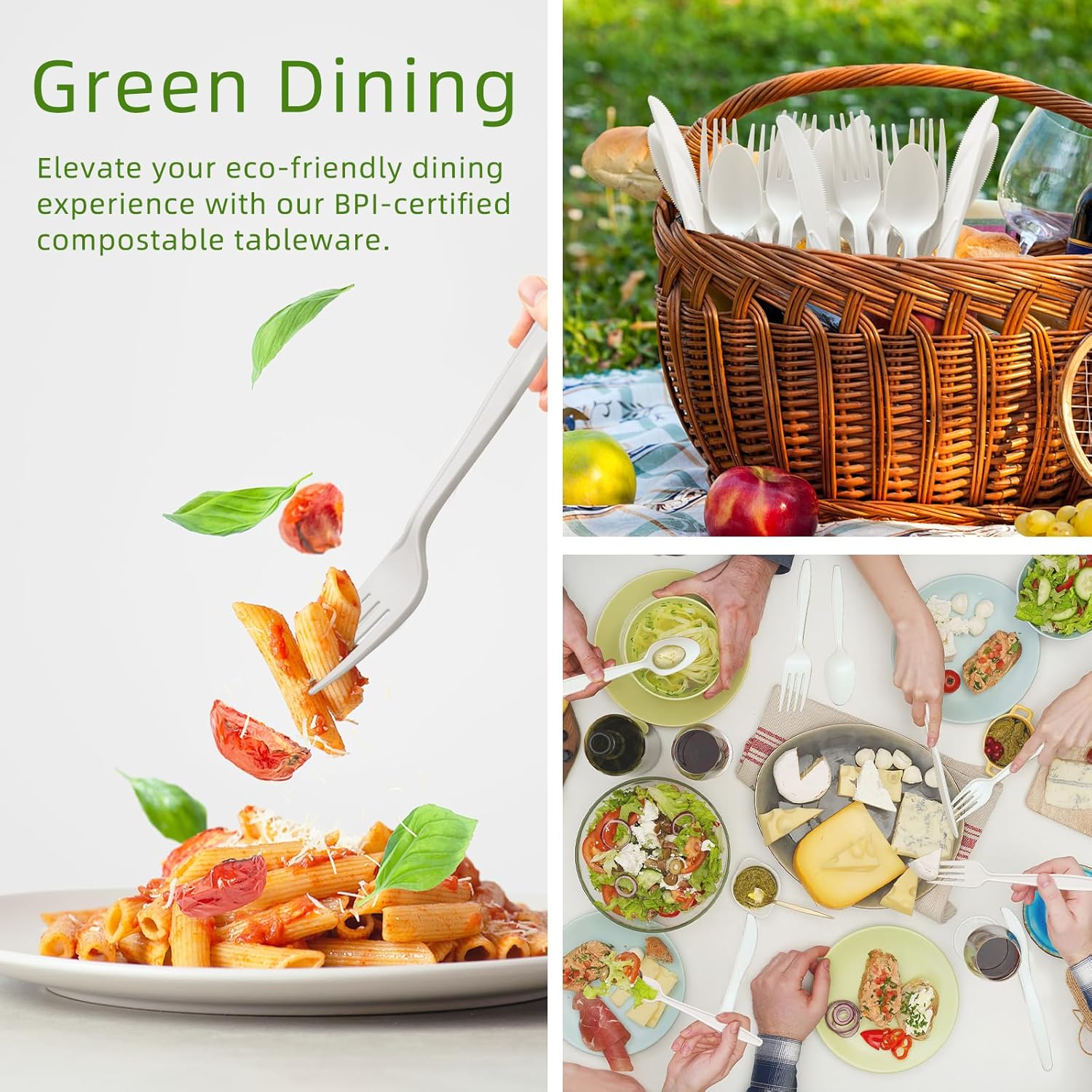 - 【Natural Corn Starch Material】Our plastic silverware made from natural corn starch, this compostable utensil is truly plastic-free and compostable. It contains no BPA or other chemicals, eliminating safety hazards from the source and ensuring safety even with repeated use. Compared to traditional disposable cutlery, our plastic silverware edges are finely polished for a smooth, providing a more pleasant dining experience.