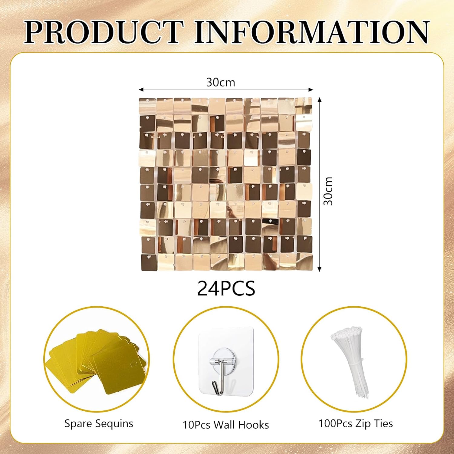 - 【Package Includes】Each box includes 24 champagne gold wall panels (12"x 12" each). We provide enough zip ties (100 pcs), a pack of spare sequins, and wall hooks (10 pcs) to support the weight of the wind panel, as well as an installation manual. 24pcs can cover 4x6ft place. More boxs will cover a larger area and have a fuller look.