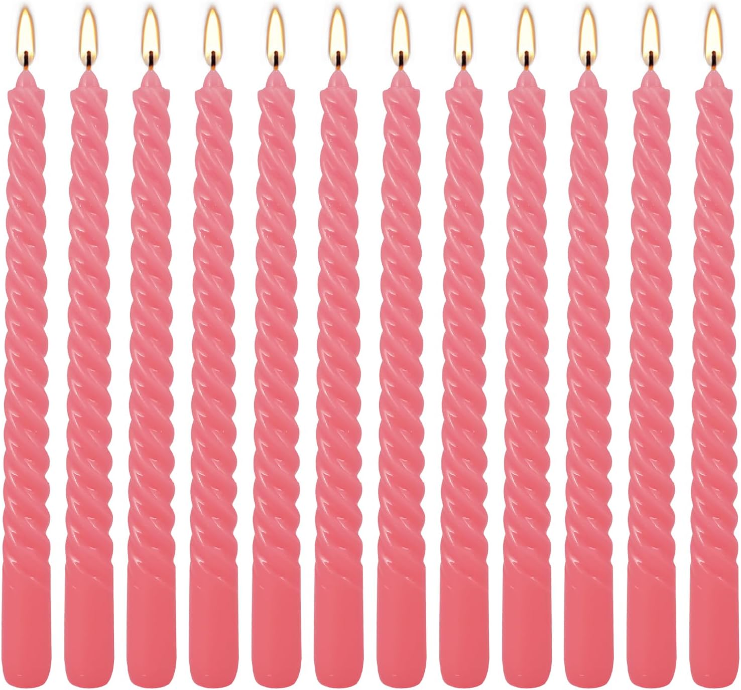 12-Pack Pink Spiral Taper Candles – 10 Inch Elegant Dripless & 10-Hour Burn – Long-Lasting Decorative Candles for Weddings, Birthdays, Parties, Church, Home Decor & Romantic Dinners