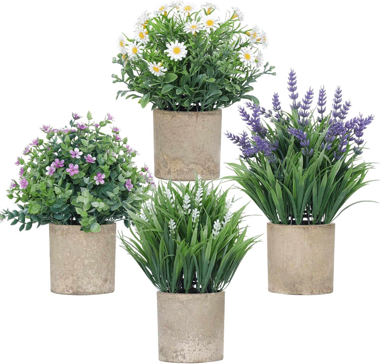 - Small Size & Adjustable Shape: This set includes 4 small artificial plants: a eucalyptus plant with flowers, a purple lavender, a white lavender, and a white daisy. The purple lavender measures 10.6 inches in total height, while the other three plants stand approximately 9 inches tall (from the top of the plant to the bottom of the pot). All plants span about 5.9 inches in width when the leaves are fully spread. The gray paper pulp pots are about 2.95 inches wide and 3.1 inches tall. You can gently adjust the leaves to achieve your desired shape and fullness. NOTE: The leaves may be slightly compressed during shipping — simply reshape