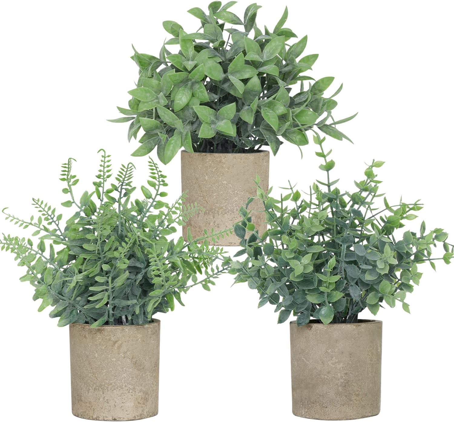 - Small Size & Adjustable Shape: This set includes 3 small green artificial plants: a eucalyptus, a Boston fern, and a boxwood. Each measuring approximately 9.4 inches in total height (from the top of the plant to the bottom of the pot) and 5.9 inches in width when the leaves are fully spread. The gray paper pulp pots are about 2.95 inches wide and 3.1 inches tall. You can gently adjust the leaves to achieve your desired shape and fullness. NOTE: The leaves may be slightly compressed during shipping — simply reshape them by hand to restore their natural appearance