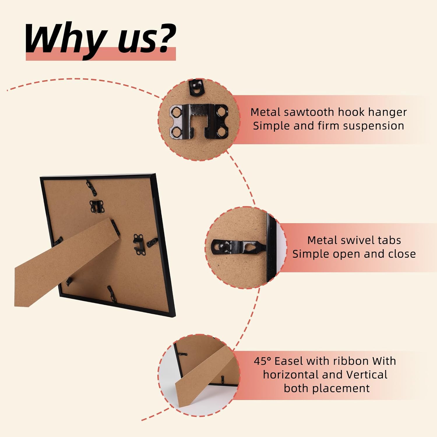 - Effortless Setup & Display: Each 8.5x11 photo frame features 4 secure snap-tabs for easy loading. The frames include both a kickstand for tabletop use and a pre-installed hanger for walls. Display your documents horizontally or vertically in seconds.
