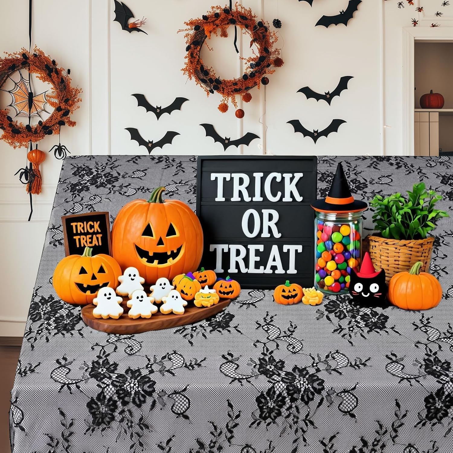 Black Tablecloth Halloween Lace Table Fabric 2pcs 60x120 Inch for Scary Movies Rustic Wedding Bridal Shower Party Decoration Rectangle Overlay Vintage Embroidered Reception Table Cloth Decor