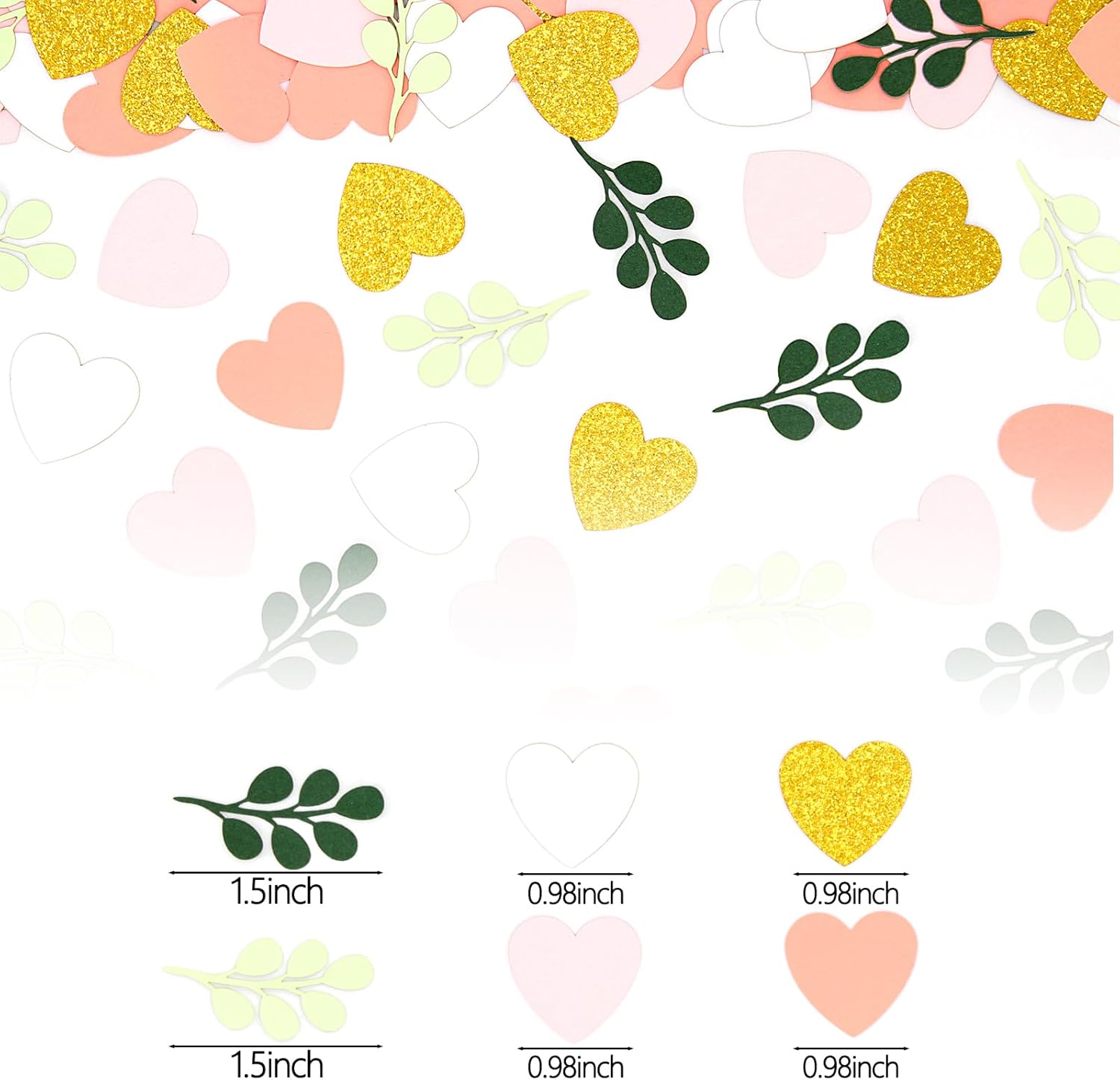 - 5.Lovely Size and Premium Material.The heart confetti width 0.98inch,the sage leaves 1.5inch width,looks perfect with premium fresh color papercard,adding a charming and energetic sense to your party table decorations.