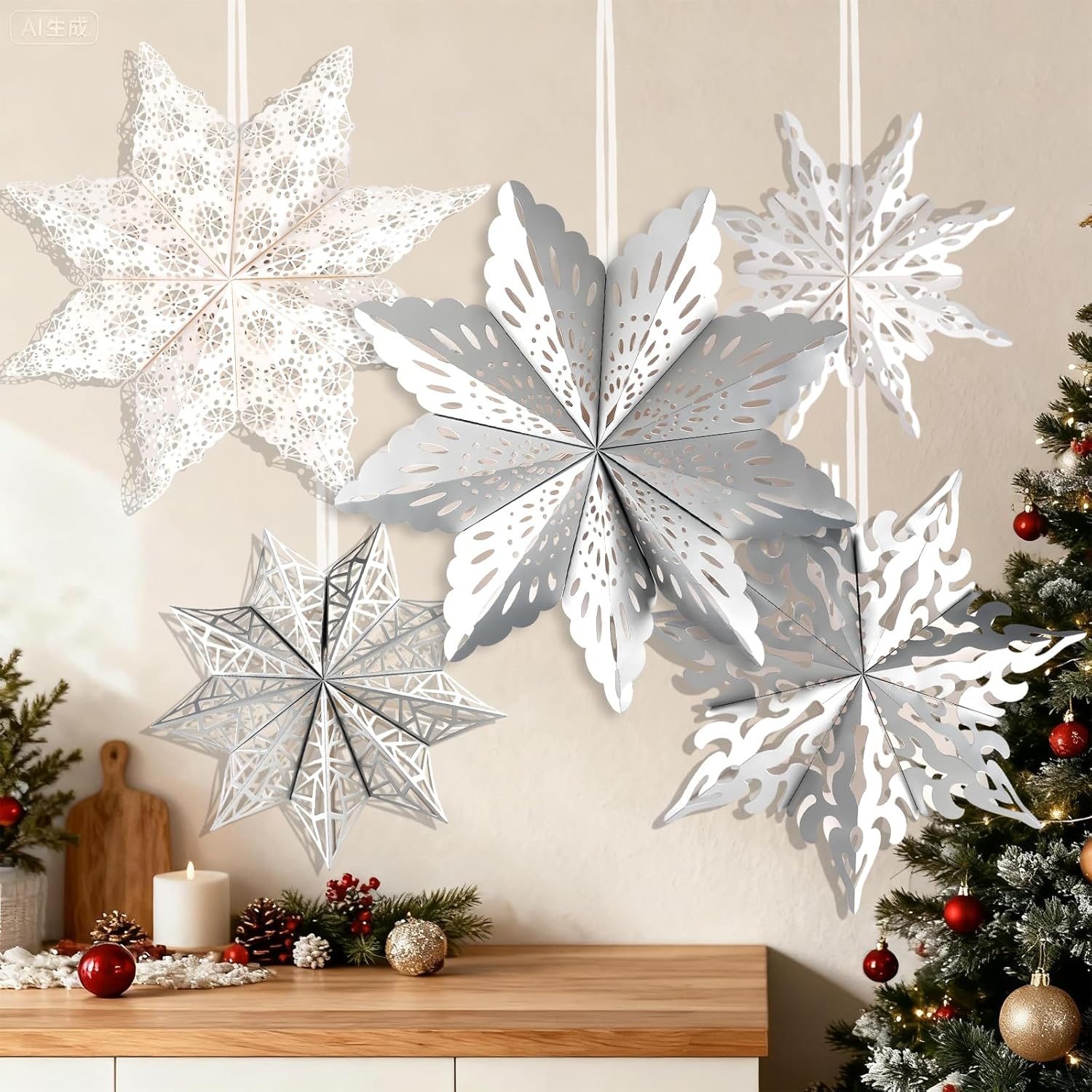 - Unique Snowflake Designs: This Christmas paper snowflake lanterns set includes 5pcs led lights and a remote control,3pcs silver paper snowflake lanterns, 2pcs white paper snowflake lanterns, each beautifully crafted with intricate hollow out cutout designs. Measuring 14 to 18 inches, these eye-catching hanging christmas decorations add a magical winter touch to your holiday décor