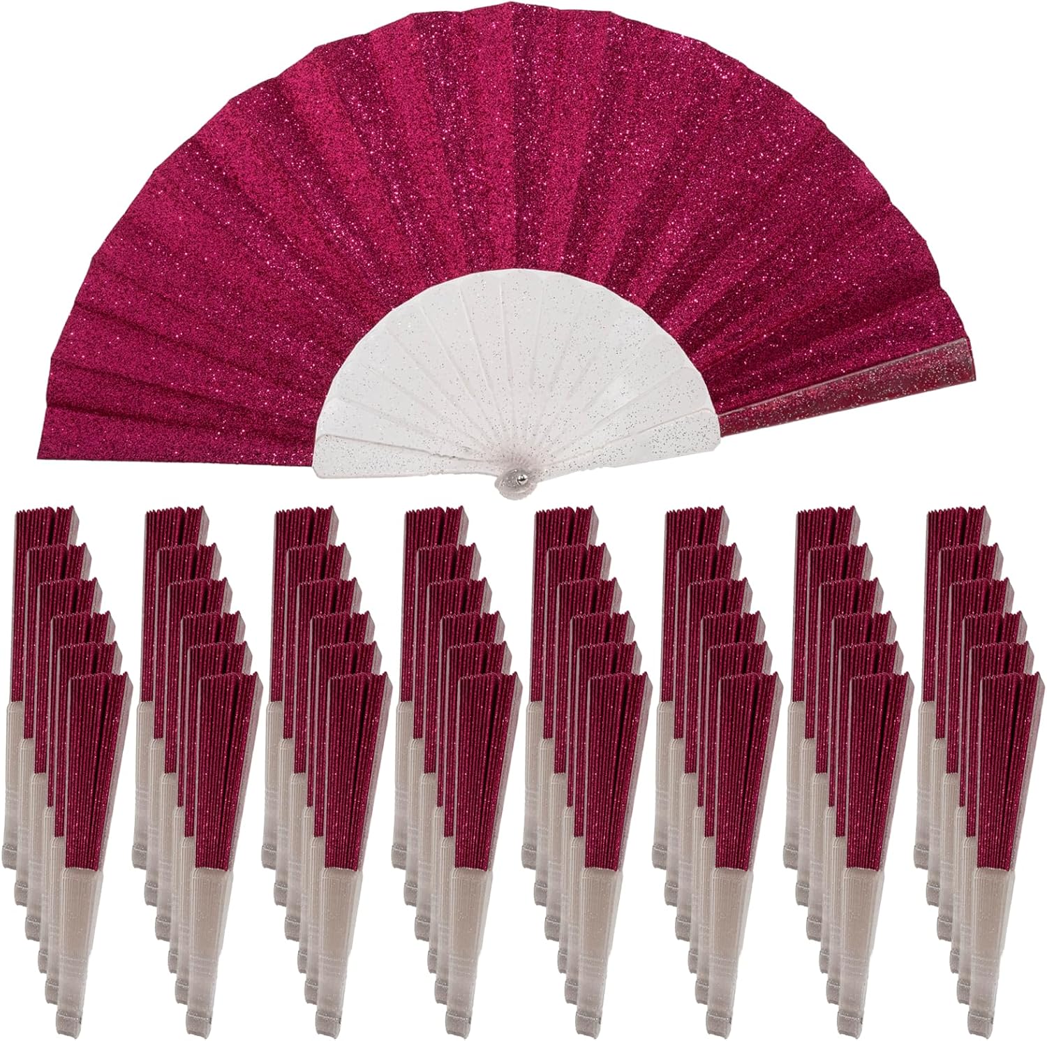 48 Pack Handheld Fan,Folding Hand Glitter fan with Shining Transparent Fan Rib – Ideal for Wedding, Church, Festival, Dance, Tea Party, Club, and EDM Accessories, Deep pink