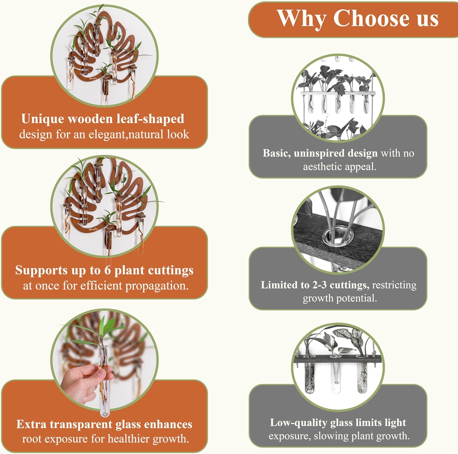 - Enhanced Growth – Grow up to 6 cuttings at once with our hanging wall planter. It provides better light exposure for root development, designed with extra-transparent propagation tubes, promoting healthier growth for your plants. The spacious test tubes allow plant cuttings to thrive, making propagation easier and more efficient.