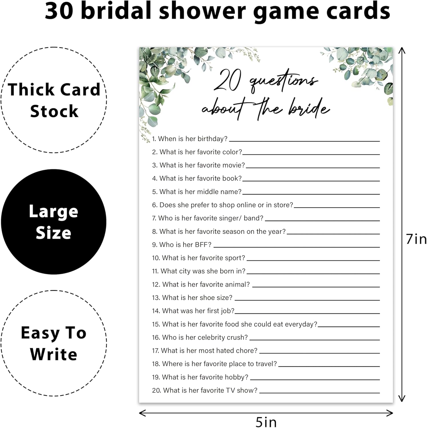 Eucalyptus Bridal Shower Game Cards - 20 Questions About The Bride, Wedding Engagement Bachelorette Party Bridal Shower Games for 30 Guests, Double Sided Cards Set of 30, Activity Supplies & Favor/A14