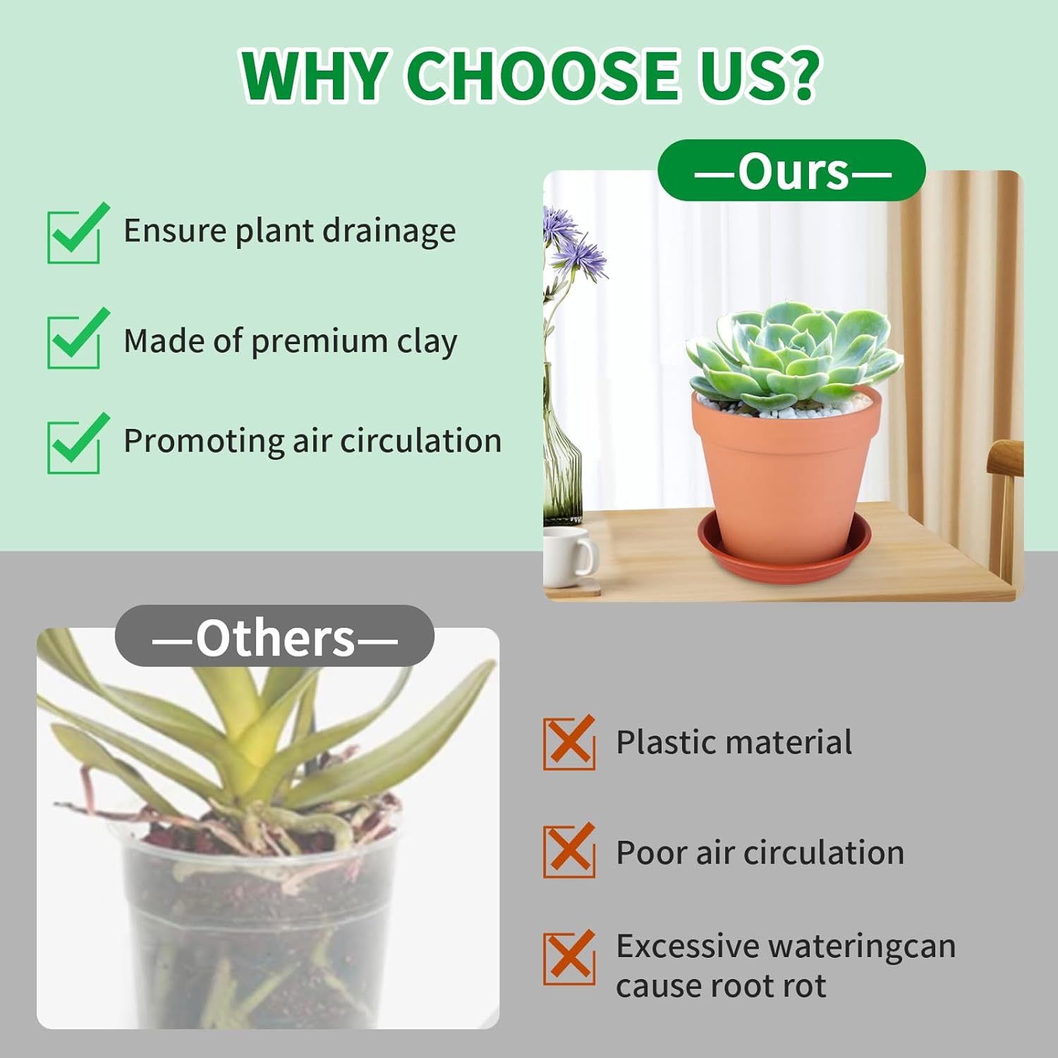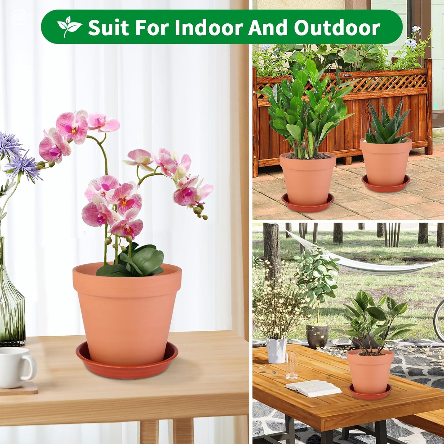 - 【Optimal Plant Health & Cleanliness】 6 inch porous clay pots promote superior airflow and drainage, preventing overwatering and root rot for healthier plants. Included meshes and saucers keep surfaces tidy by capturing excess water and soil.