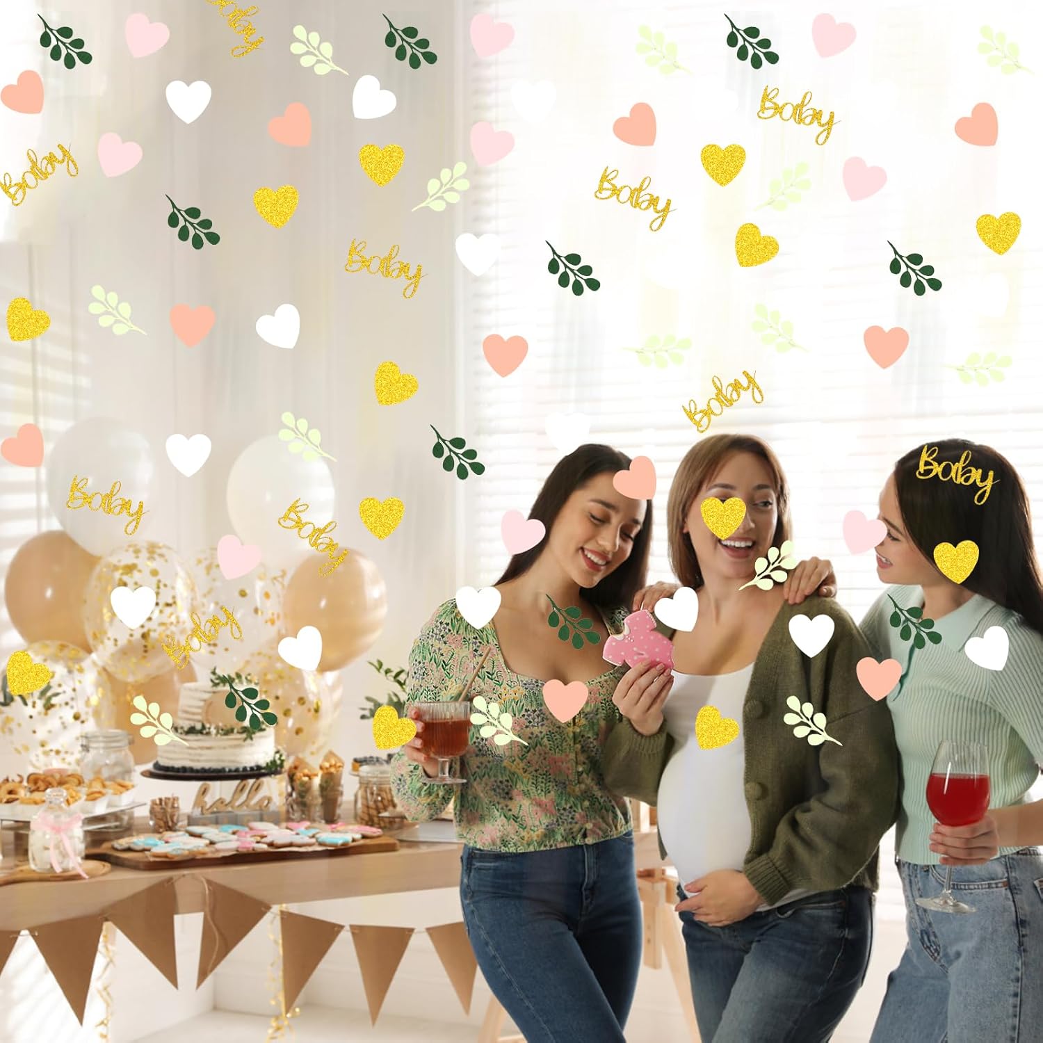 - 1.The baby girl baby shower decorations confetti package include:200pcs total,there are 3designs heart sage leaves and “baby” letters in 6 colors(shiny gold/light green/dark green/white/blush pink/peach pink),looks warm and full of vigor.