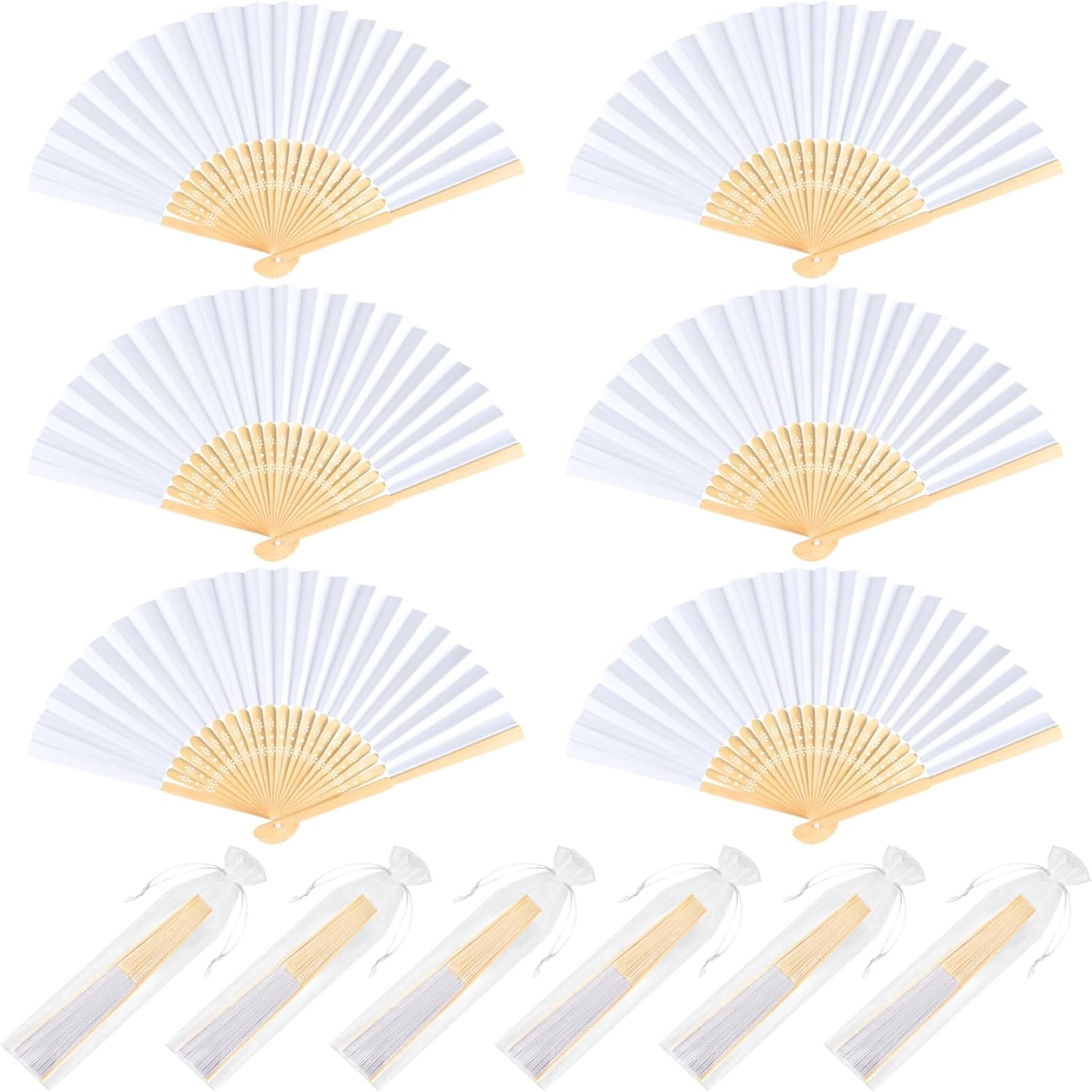 - Set Contents: You will get 6 white paper fans, each folding fan comes with a mesh bag, which are good looking and practical, can meet various occasions needs