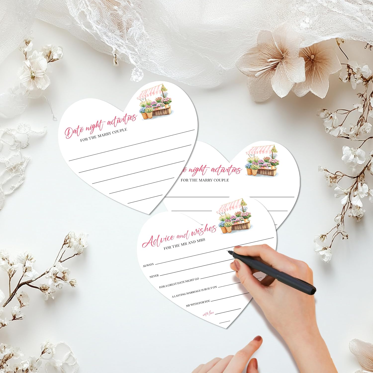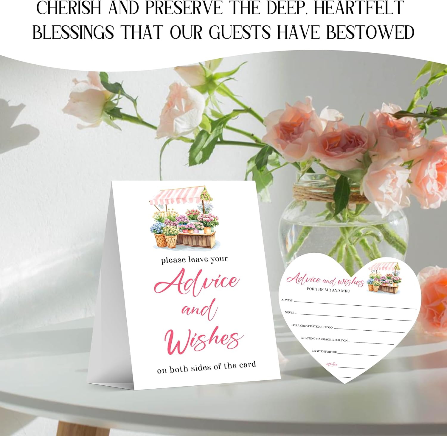 - Applicable specifications: Comes with 25 5.3x5.9 inch double-sided heart-shaped wishes cards. On one side, there are "advice and wishes" written, while on the other side, there are "date night activities" written. It also includes a 5x7 paper standing sign to guide guests, making it an ideal choice for wedding decoration and bridal showers