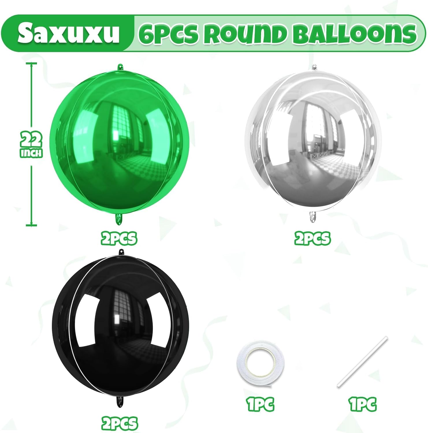 - Package Contains – 6 pcs 22-inch green silver and black round foil balloons, 1 pc straw and 1 pc ribbon. These large, eye-catching balloons are perfect for elevating your party decor with a bold and stylish touch.