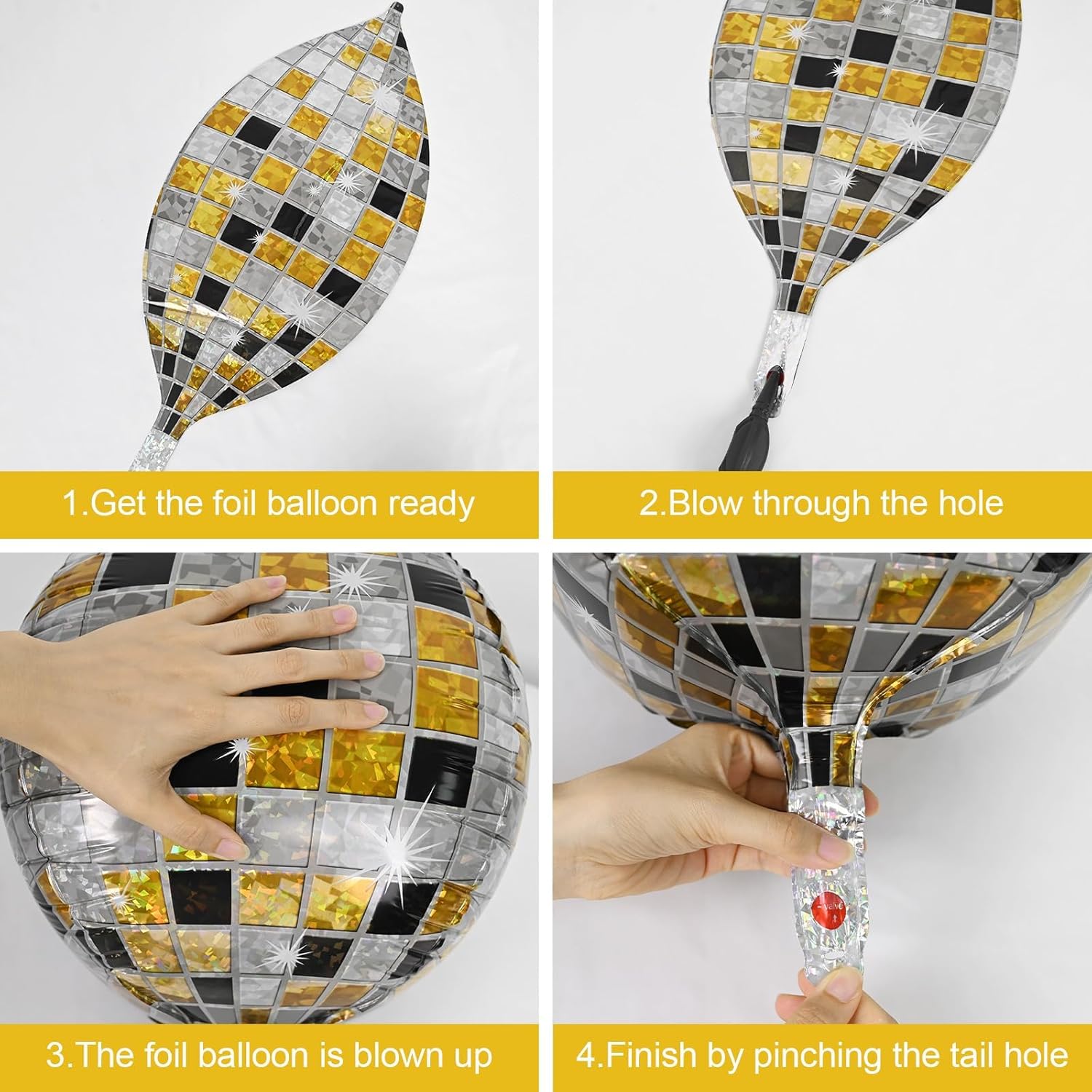 - EASY TO USE:These black gold silver disco ball decorations balloons can be filled with air or helium.pinch the inflation port of the disco balloon to seal it.the set comes with a straw and ribbon,after the party is over,use the straw to deflate by inserting it into the inflation port,balloons can be reused