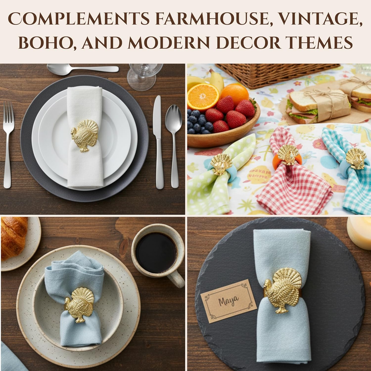 Set of 12 Turkey Napkin Rings for Thanksgiving Table Decor | Premium Metal Dinnerware Holders | Fall Harvest, Christmas & Holiday Banquet Accessories (Gold) - ALPHA Living HOME