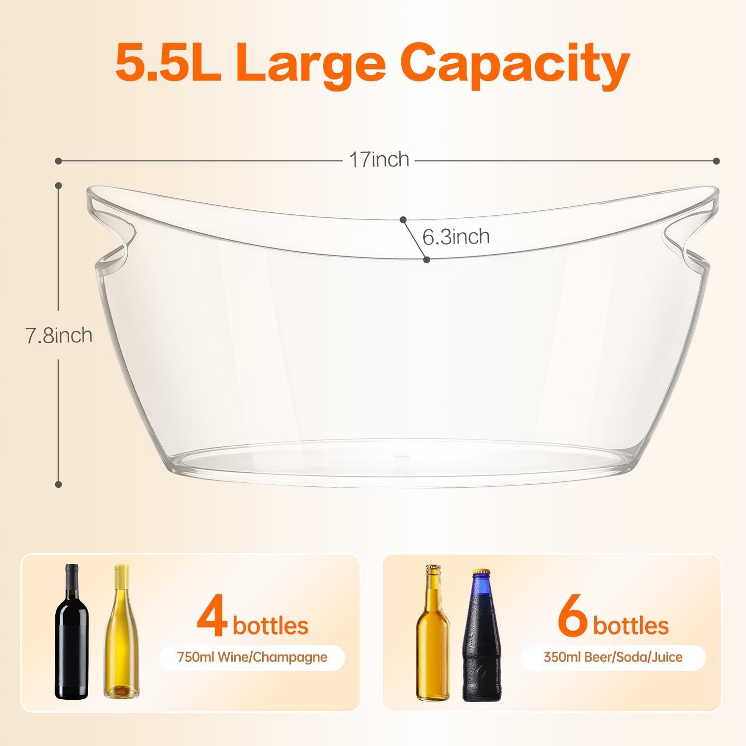 - Boasting a massive 5.5L capacity, this large ice bucket effortlessly chills 2-3 bottles of wine or 5-7 beers with ample ice. As the ultimate large ice buckets for parties, it's your go-to for keeping drinks icy cold for hours. Its generous size also makes it a versatile ice tub for drinks and a classic wine buckets for parties.
