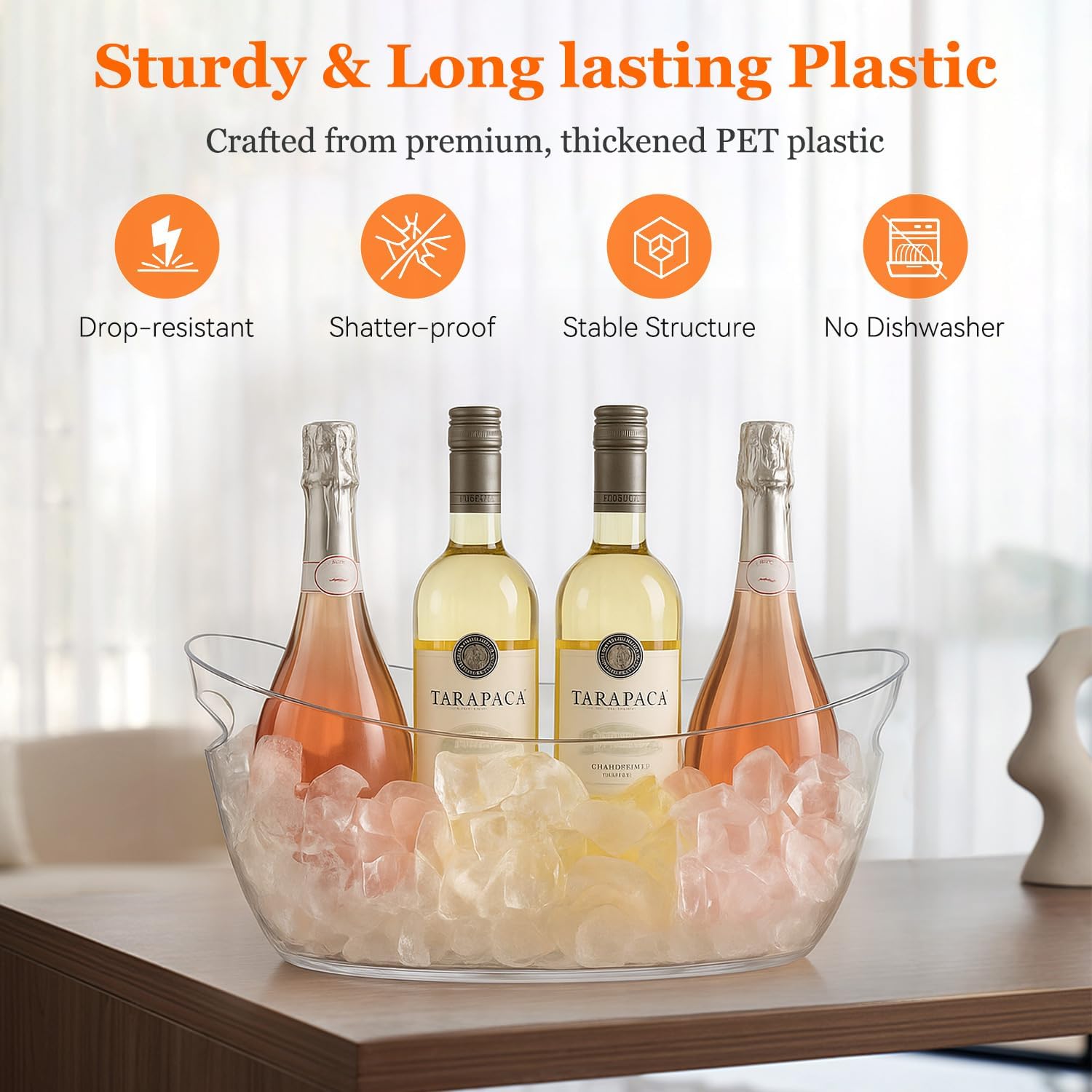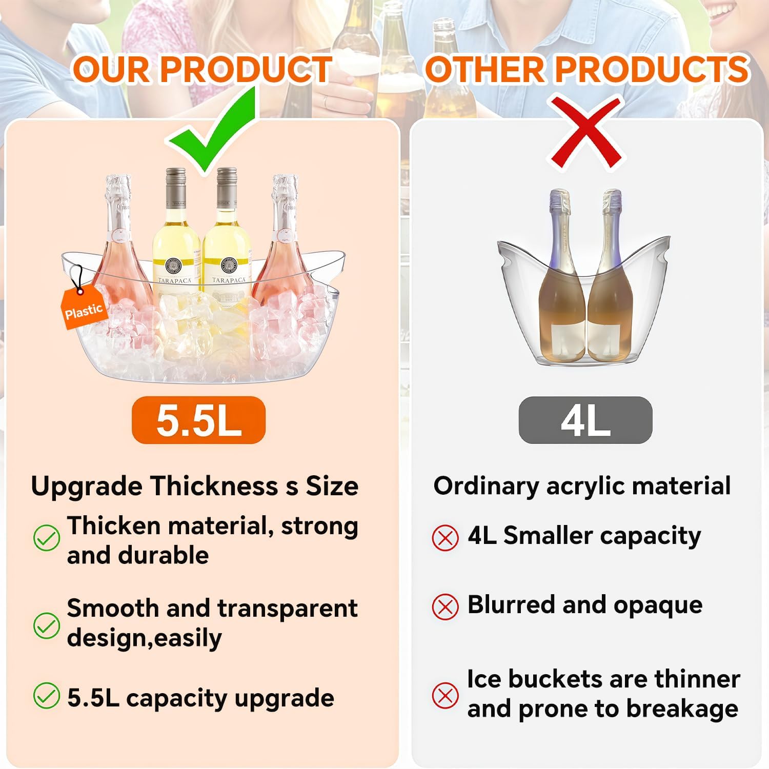 - Crafted from premium, thickened acrylic, this clear drink bucket allows you to monitor ice levels at a glance. The built-in handle ensures easy portability for any party ice buckets setup. Unlike metal tins, this sturdy plastic ice buckets is rust-proof, dent-resistant, and won't scratch easily, guaranteeing long-lasting use.
