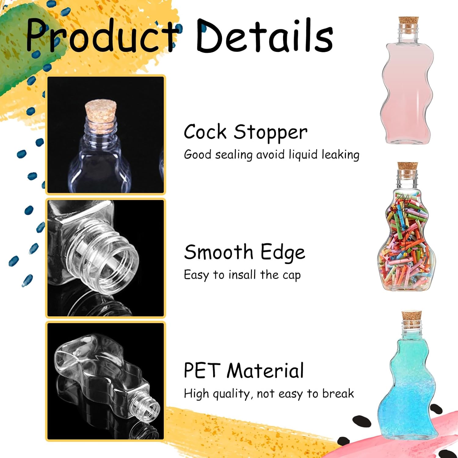 - 60 PACKS IN 3 SHAPES: Includes 60 transparent plastic bottles in 3 distinct wave-style designs (20 each), paired with cork stoppers. Each bottle holds approx. 2.5oz / 75ml—ideal for layered sand art, dried flowers, or creative DIY fillers