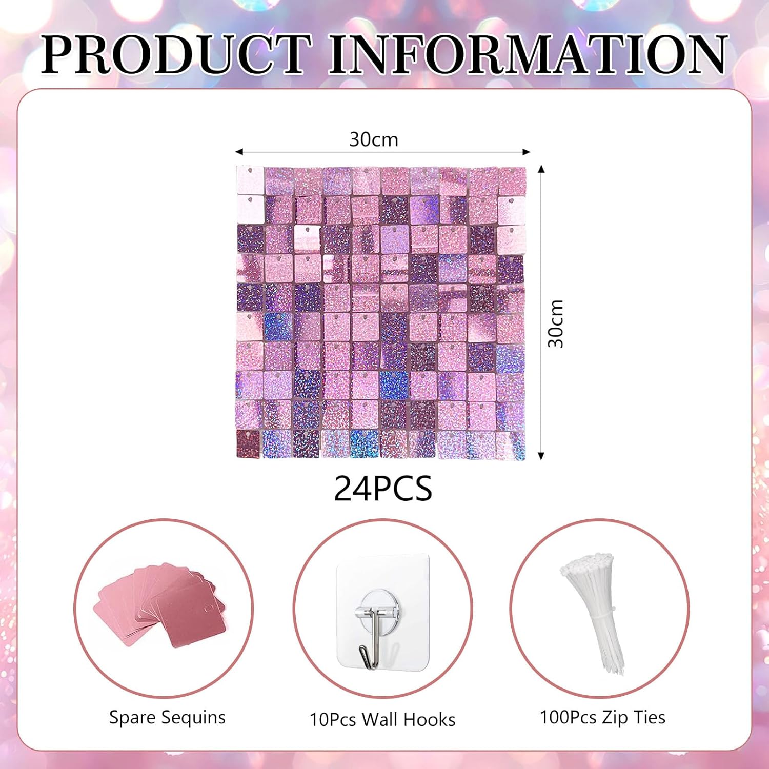 - 【Package Includes】Each box includes 24 light pink laser sequin wall panels (12"x 12" each). We provide enough zip ties (100 pcs), a pack of spare sequins, and wall hooks (10 pcs) to support the weight of the wind panel, as well as an installation manual. 24pcs can cover 4x6ft place. More boxs will cover a larger area and have a fuller look.