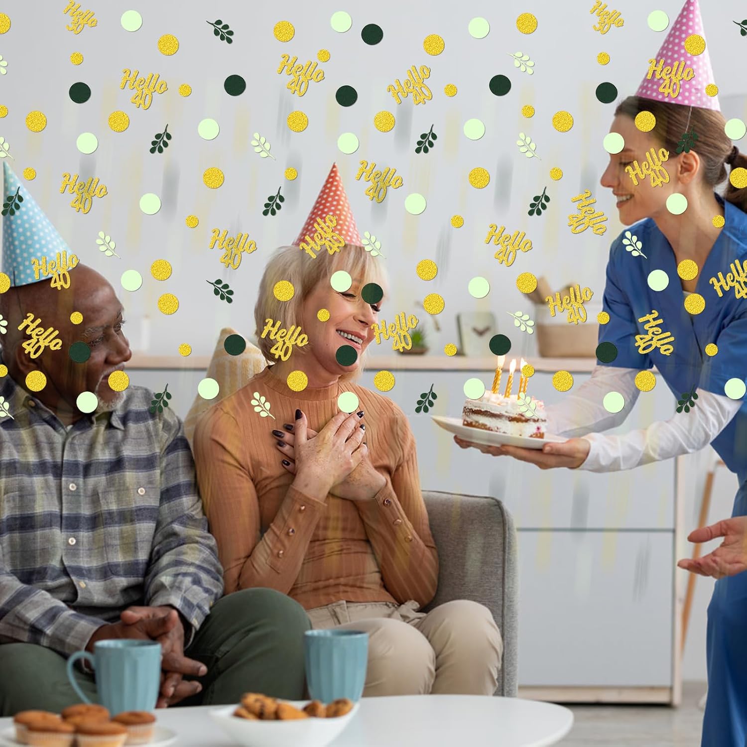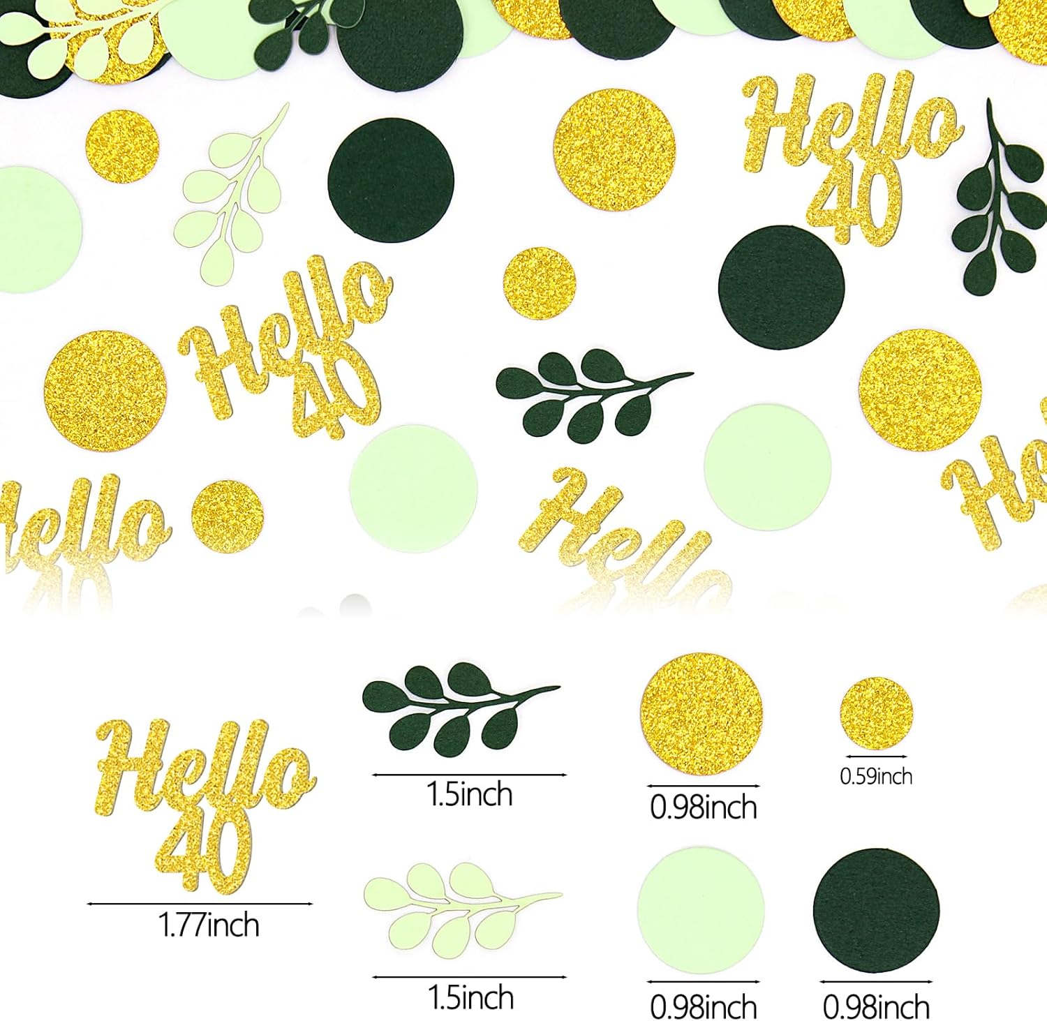 - 1.Great Addition to 40 Birthday Party.The green and gold circle dots with hello 40 confetti scatter are shiny and fresh,very sparkle,a perfect addition to 40th birthday theme,nice sage green 40th birthday decorations for women/men.