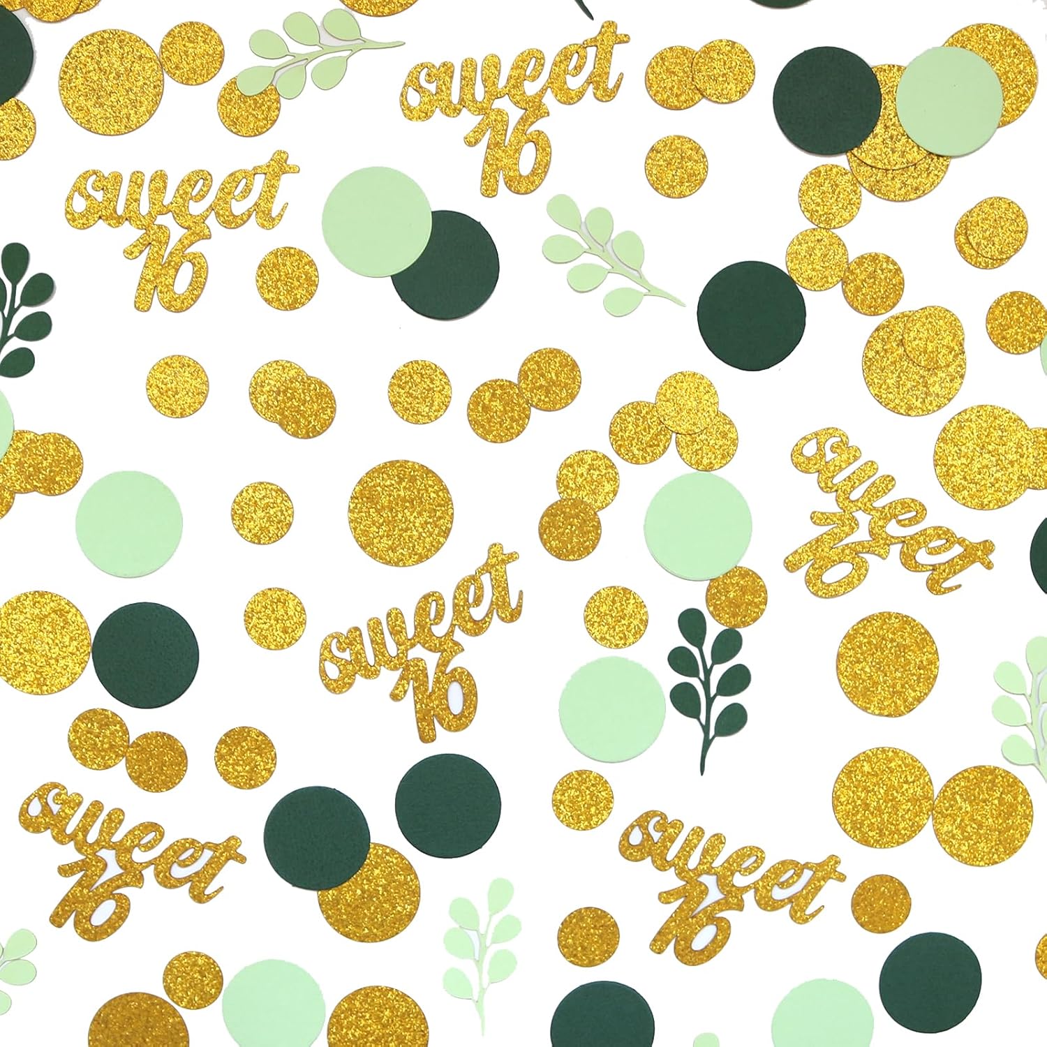 - 1.Great Addition to Sweet 16 Party.The green and gold circle dots with sweet 16 confetti scatter are shiny and fresh,very sparkle,a perfect addition to 16th birthday theme,nice green nature neutral boy/girls 16th birthday decorations.