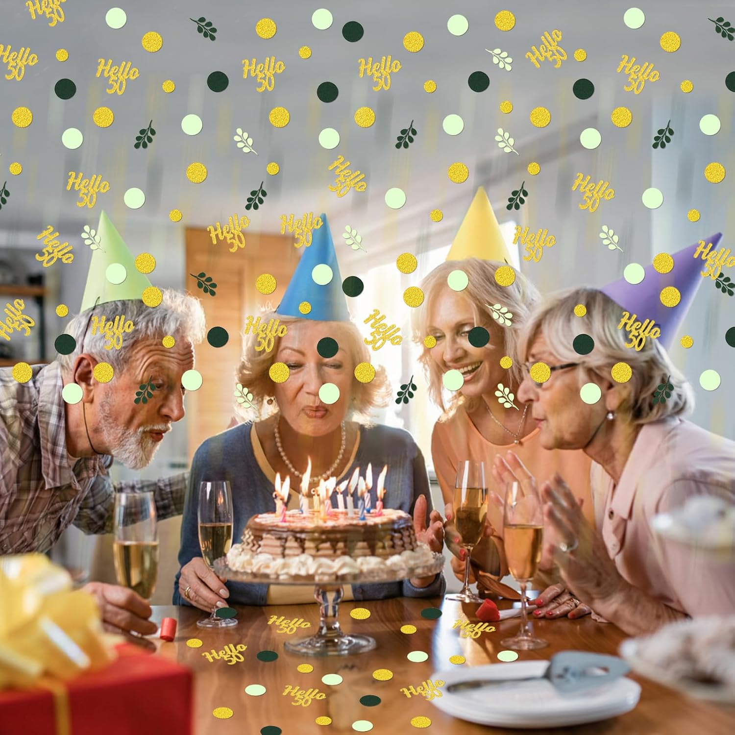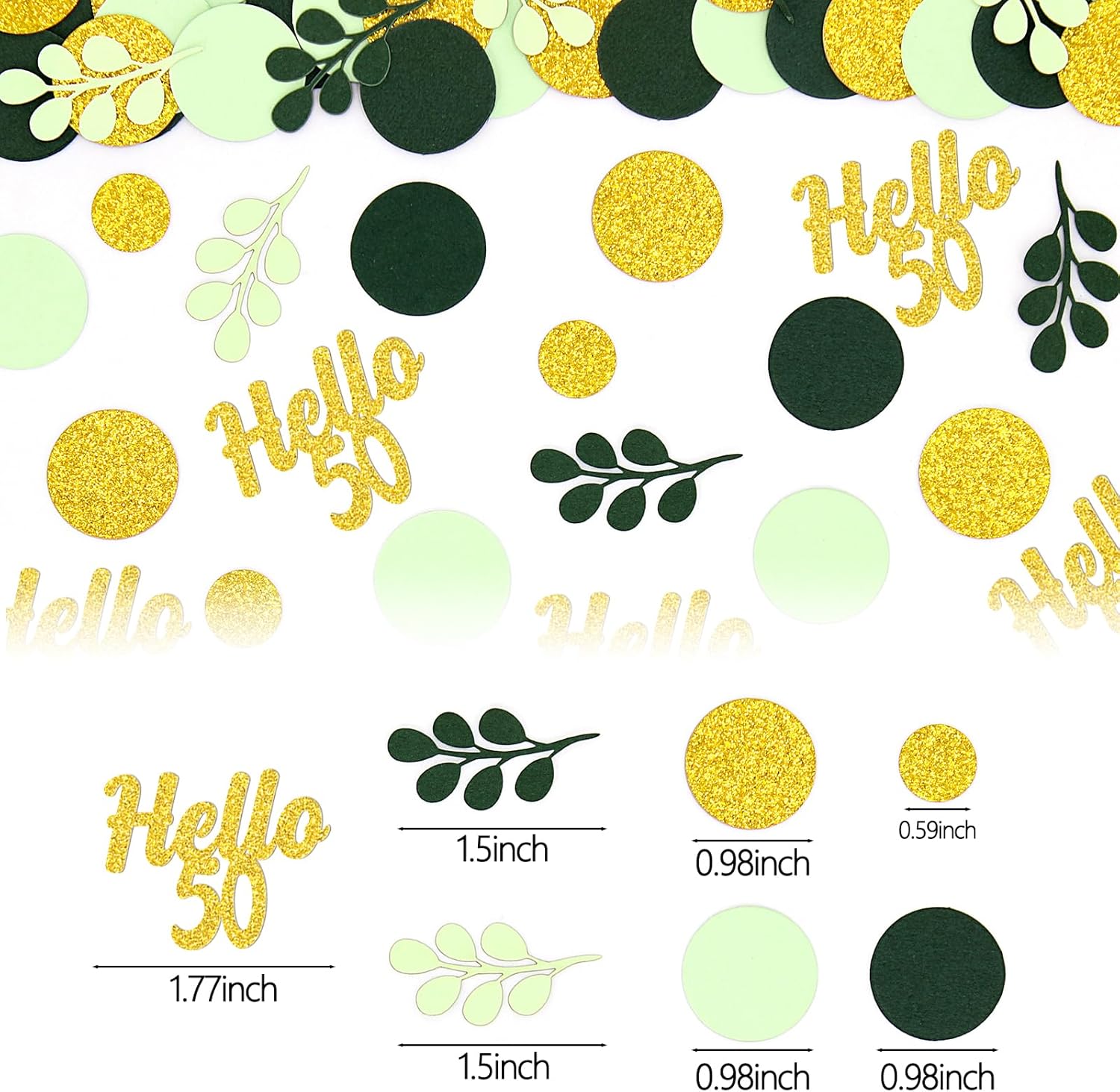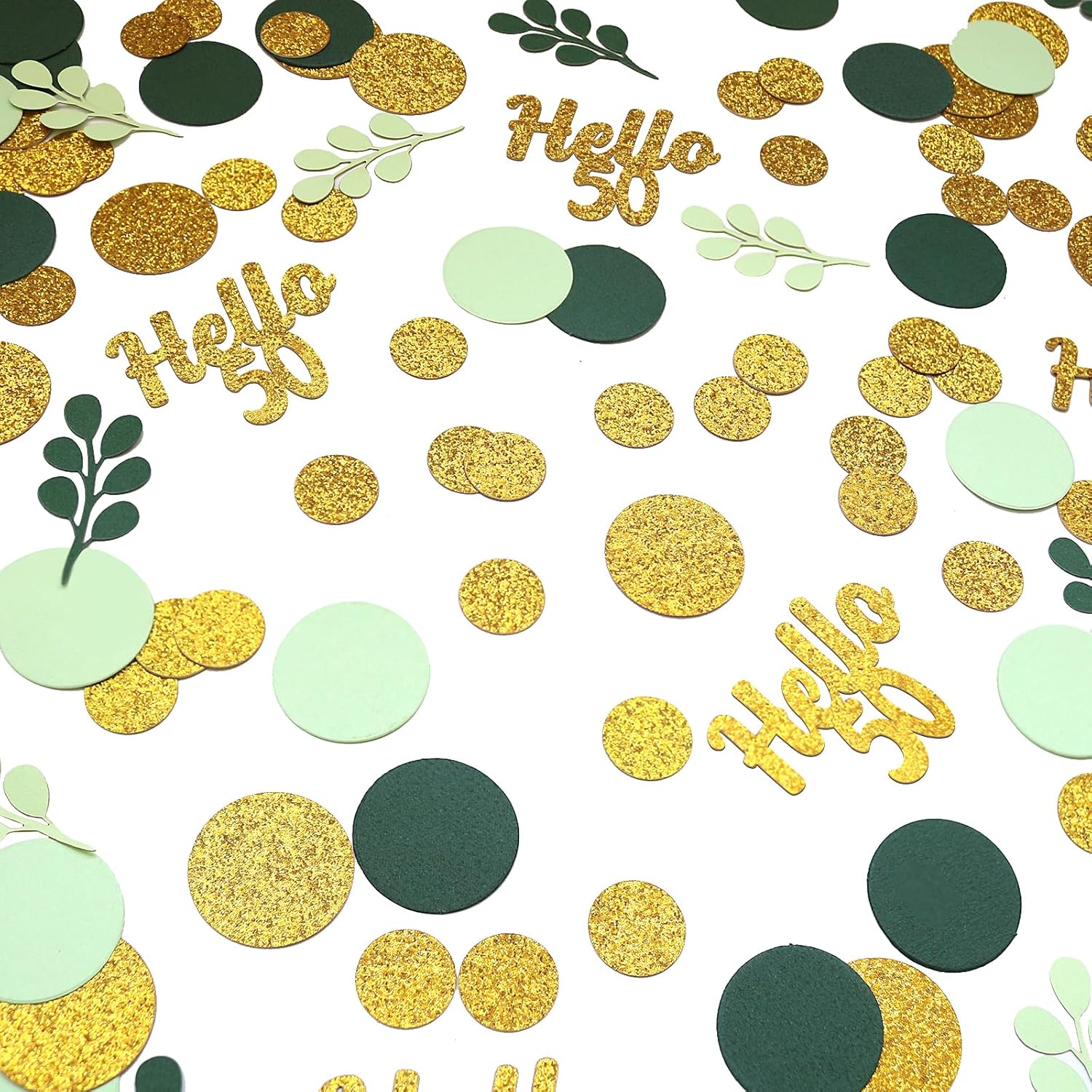 - 1.Great Addition to 50 Birthday Party.The green and gold circle dots with hello 50 confetti scatter are shiny and fresh,very sparkle,a perfect addition to 50th birthday theme,nice sage green 50th birthday decorations for women/men.
