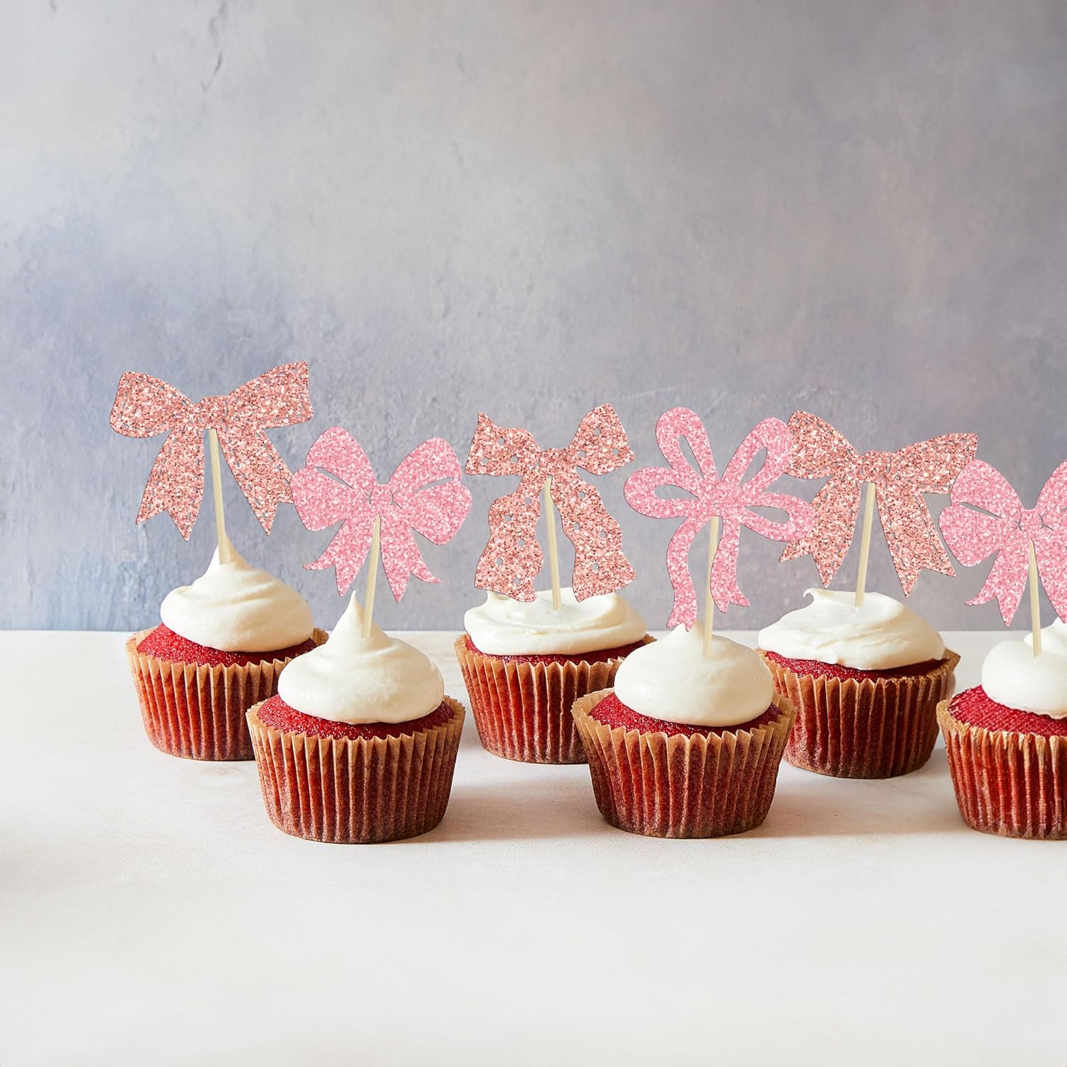 Ephlyn 24pcs Pink & Rose Gold Bow Cupcake Toppers - Perfect for Birthday, Baby Shower, Bridal Shower & Wedding Parties