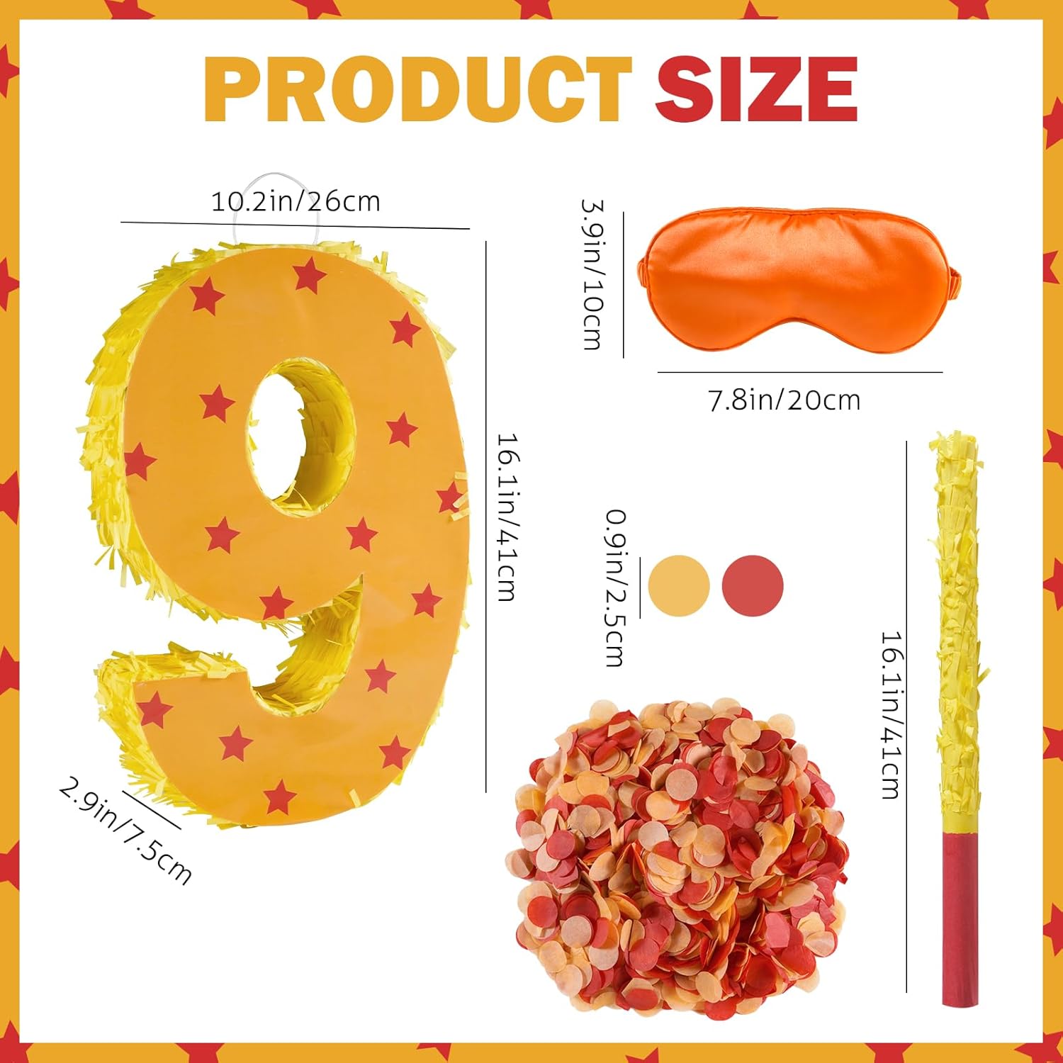 - Package Includes: This set includes a orange and red star number 9 Pinata, 30g confetti,a stick, a blindfold.It is very suitable for creating a cheerful party atmosphere for birthday party.