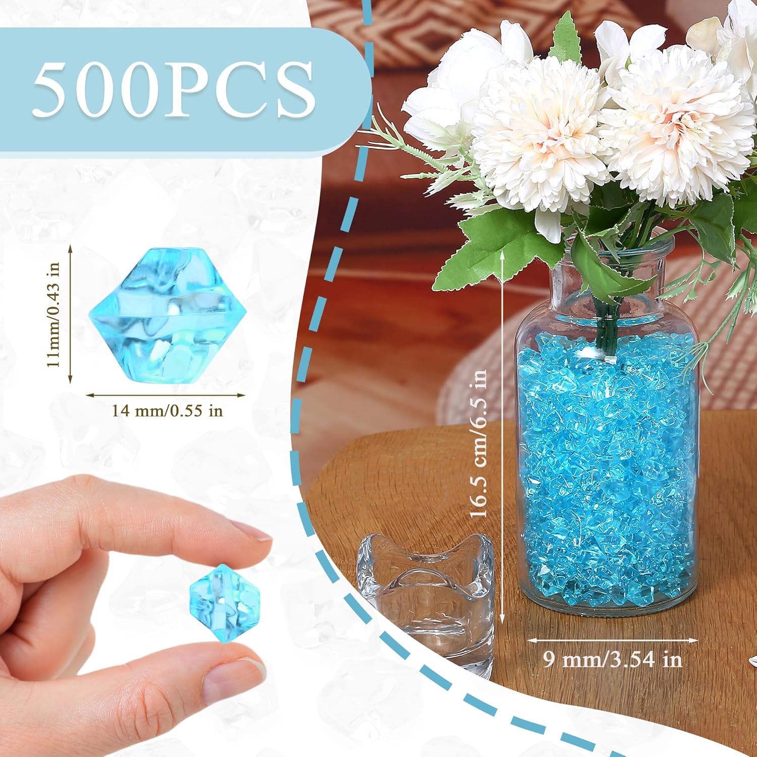 - Lake Blue Acrylic Ice Cubes – Each box includes 500 lake blue fake ice cubes, approx 11–14mm irregular acrylic gems. Ideal as vase fillers, table scatter, wedding centerpieces, and party décor. Lake blue adds a serene, coastal vibe to events and home styling
