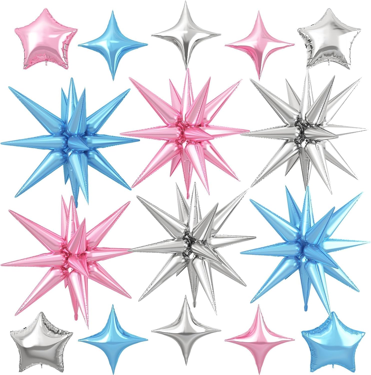 - Package: This set includes 6pcs 22inch explosion star foil balloons(pink*2, blue*2, silver*2), 4pcs 10inch star foil balloons(silver*2, pink*1, blue*1), 6pcs 10inch four angle star balloons(pink*2, blue*2, silver*2), and a ribbon. Perfect for creating a dazzling party atmosphere.