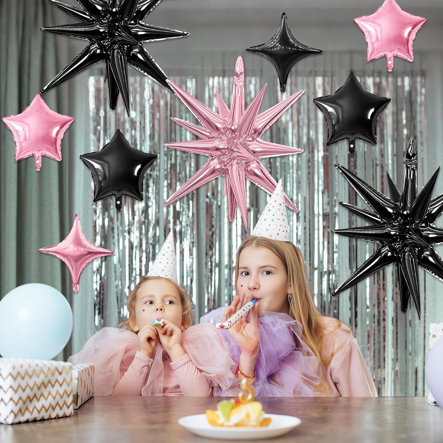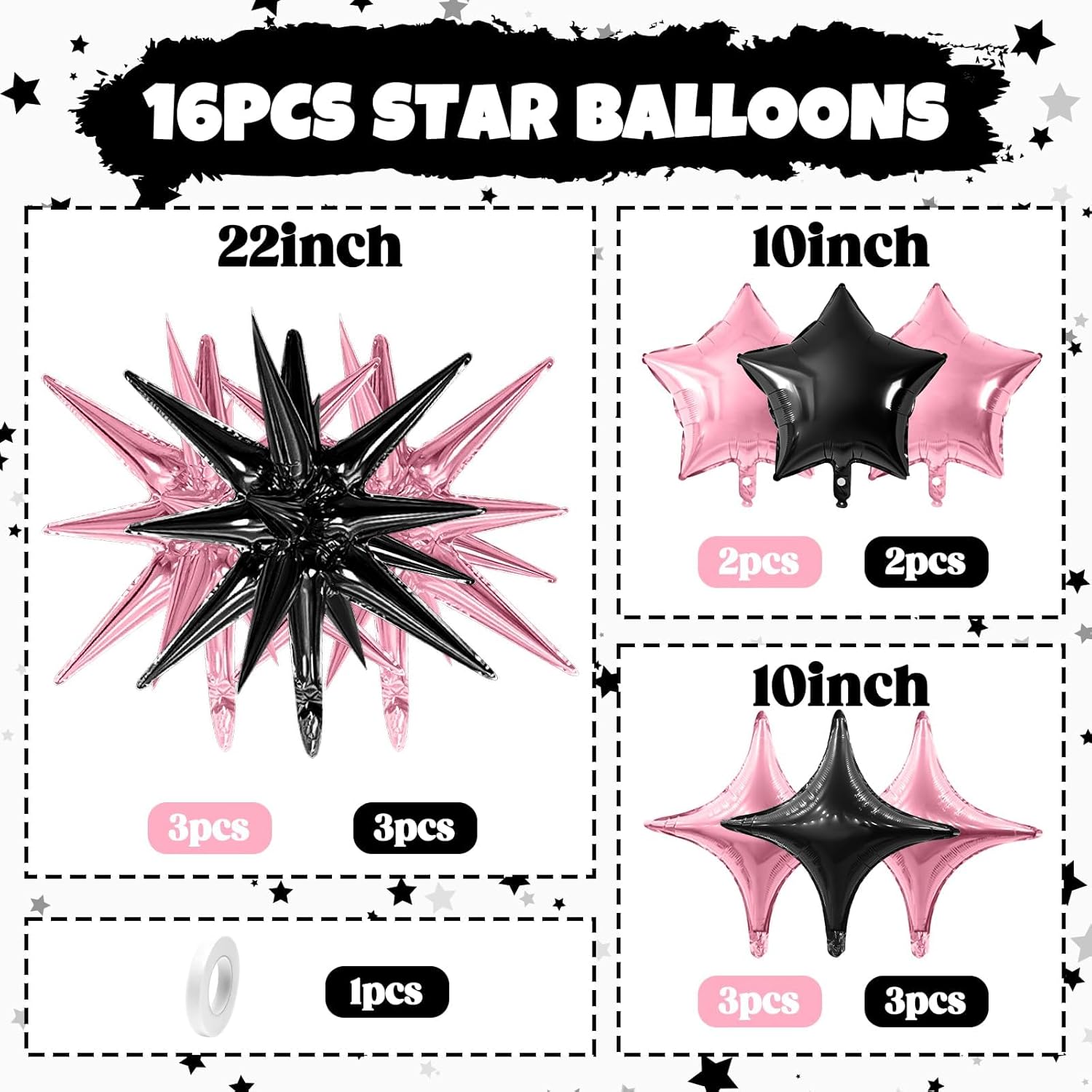 Pink Black Star Balloon,16Pcs Star Foil Balloons Set with 22Inch Explosion Spike Cone Balloons and 10Inch Quadrangle Helium Balloon for Birthday Wedding Baby Shower Party Decorations