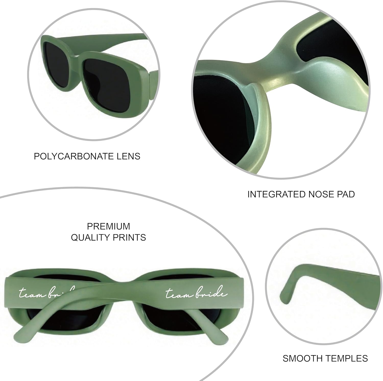 - 【Bachelorette Sunglasses Set】 One white pair of "Bride" sunglasses for bride to be and nine sage green "Team Bride" sunglasses for bridesmaid. Plastic frames and lenses have scratch resistant coating - surprisingly durable for the price