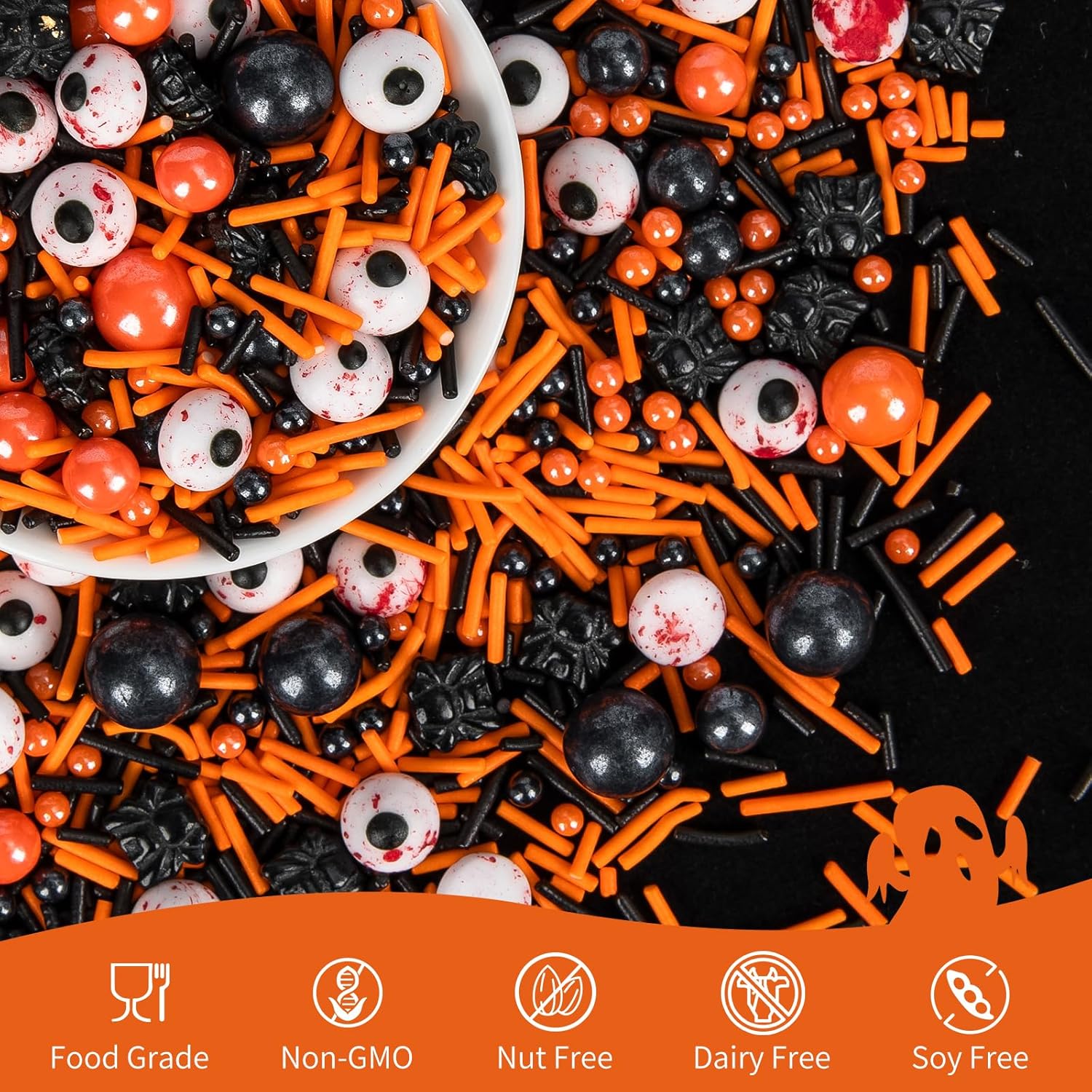- Edible Halloween Terrifying Sprinkles with food-grade raw materials: Preservative Free,Nut Free, Dairy Free, Chemical Free,Soy Free,Non-GMO.Produced using food-safe standards, the process does not come into contact with allergenic substances and uses Tamper-proof food label.They're just as safe as they are tasty
