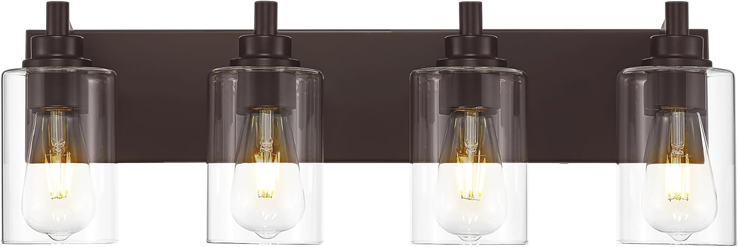 - Inspired Design: The 4-light bathroom light fixtures over mirror features a oil rubbed bronze long base metal frame and elegant cylinder clear glass shades, seamlessly fitting modern minimalist decor. You can install it upwards or downwards for versatile style