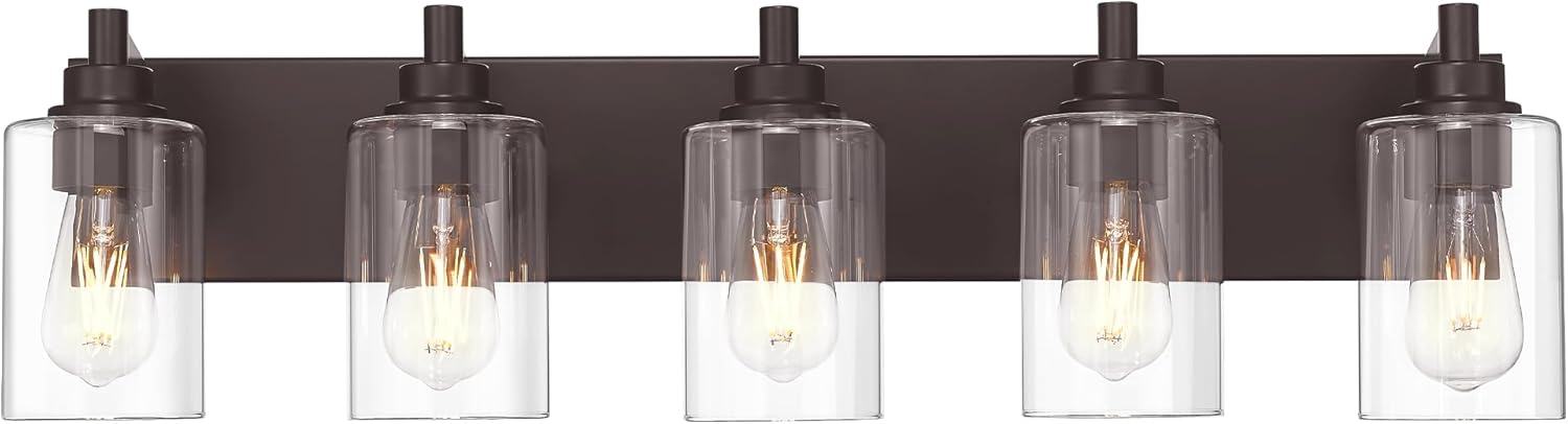 - Inspired Design: The 5-light bathroom light fixtures over mirror features a oil rubbed bronze long base metal frame and elegant cylinder clear glass shades, seamlessly fitting modern minimalist decor. You can install it upwards or downwards for versatile style