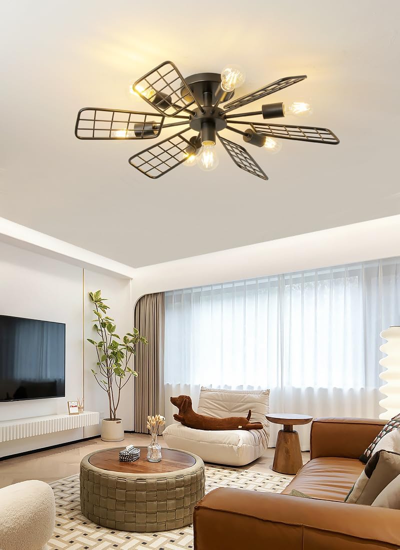 Modern Farmhouse Chandelier,28 Inch Black Metal Geometry Rustic Vintage Semi Flush Mounted Ceiling Light Fixture for Dining Room Bedroom Kitchen Island Hallway Foyer Entryway(7-Light)