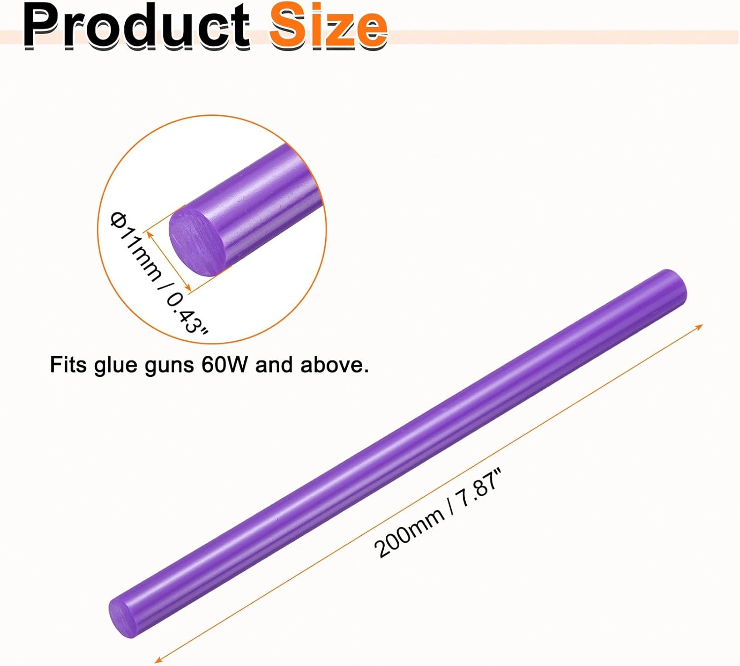- Size - Hot glue sticks size: 11 x 200mm / 0.43 x 7.87 inch (D*L); Curing time: 10–15 seconds; Working temperature: 150°C (302°F); Softening point: 75°C (167°F).