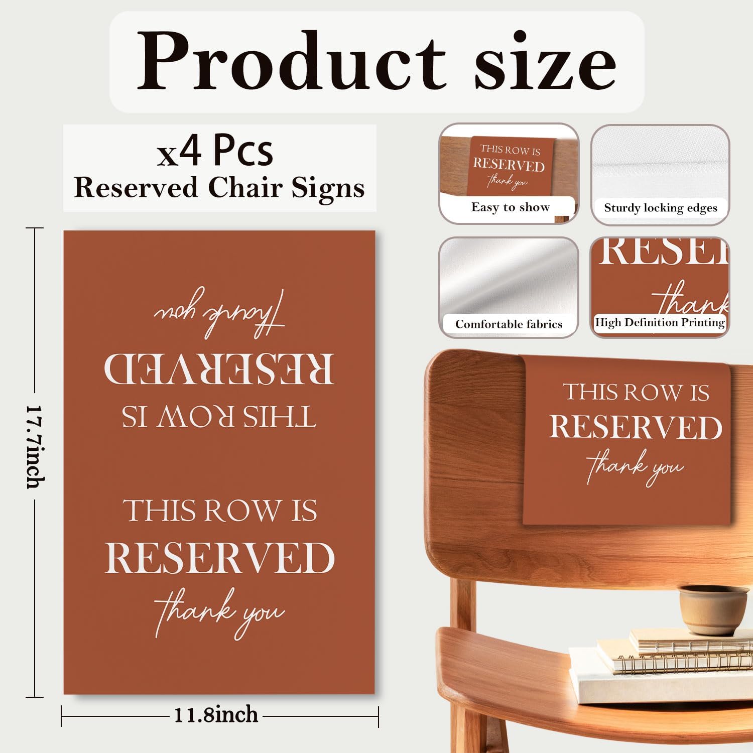 - Universal Size: Each reserved seat sign measures approx. 30 x 45 cm / 11.81 x 17.72 inches, suitable for most standard chairs, pews, or benches. The large, clear lettering ensures your message is easily seen by guests from a distance.